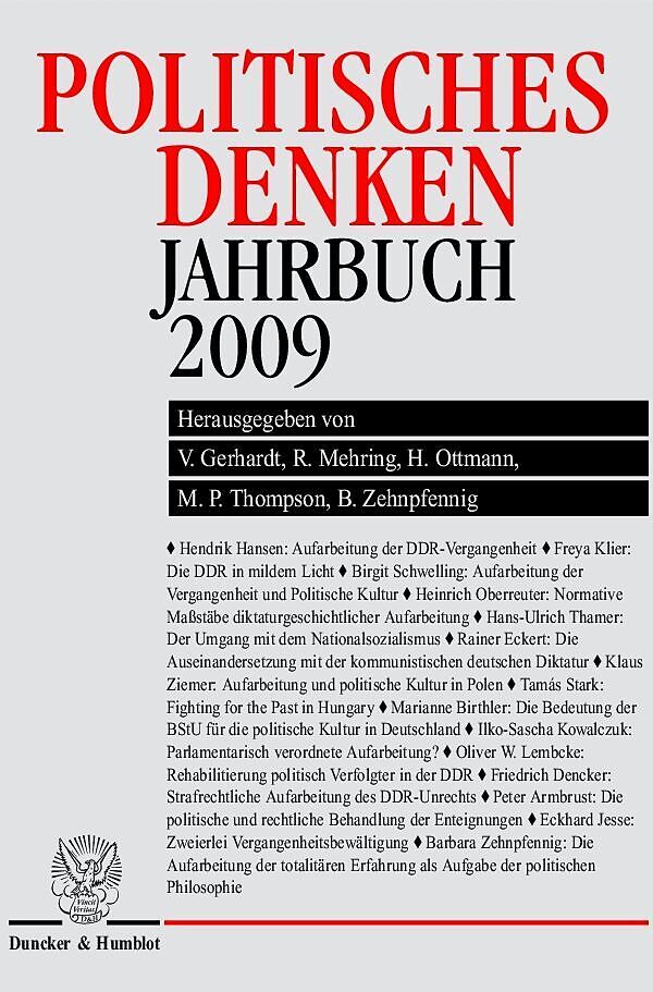 Inhalt: H.-J. Veen, Vorwort - H. Hansen, Einleitung. Die Aufarbeitung der DDR-Vergangenheit und das Rechts- und Werteverständnis im wiedervereinigten Deutschland - I. Das Konzept der Politischen Kultur im Kontext der Aufarbeitungsdiskussion: F. Klier, Die DDR in mildem Licht. Eröffnungsvortrag der Weimarer Tagung "Aufarbeitung totalitärer Erfahrungen und politische Kultur" - B. Schwelling, Aufarbeitung der Vergangenheit und Politische Kultur. Zur Bedeutung und zum Zusammenhang zweier Konzepte - H. Oberreuter, Normative Maßstäbe diktaturgeschichtlicher Aufarbeitung - II. Die vergleichende Perspektive: H.-U. Thamer, Der Umgang mit dem Nationalsozialismus und die politische Kultur in der Bundesrepublik der Nachkriegszeit - R. Eckert, Die Auseinandersetzung mit der kommunistischen deutschen Diktatur und die politische Kultur der Bundesrepublik - K. Ziemer, Aufarbeitung und politische Kultur in Polen - T. Stark, Fighting for the Past in Hungary - III. Politische Akteure und Justiz im Aufarbeitungsprozess: M. Birthler, Die Bedeutung der BStU für die politische Kultur in Deutschland - I.-S. Kowalczuk, Parlamentarisch verordnete Aufarbeitung? Die Enquete-Kommissionen des Deutschen Bundestages "Aufarbeitung von Geschichte und Folgen der SED-Diktatur in Deutschland" und "Überwindung der Folgen der SED-Diktatur im Prozess der deutschen Einheit" - O. W. Lembcke, Rehabilitierung politisch Verfolgter in der DDR. Politisches Programm und Praxis des Rechts - F. Dencker, Strafrechtliche Aufarbeitung des DDR-Unrechts und Rechtskultur - P. Armbrust, Die politische und rechtliche Behandlung der Enteignungen in der Sowjetischen Besatzungszone 1945 bis 1949 nach der Wiedervereinigung - IV. Politikwissenschaft, totalitäre Erfahrung und politische Kultur: E. Jesse, Zweierlei Vergangenheitsbewältigung, politische Kultur und Wissenschaft. Drittes Reich und DDR - B. Zehnpfennig, Die Aufarbeitung der totalitären Erfahrung als Aufgabe der politischen Philosophie - Rezensionen: H. Hansen, Andreas Gatzemann: Die Erziehung zum "neuen" Menschen im Jugendwerkhof Torgau. Ein Beitrag zum kulturellen Gedächtnis, Münster 2008 - P. Kainz, Ilko-Sascha Kowalczuk: Endspiel. Die Revolution von 1989 in der DDR, München 2009 - B. Zehnpfennig, Christoph Horn / Ada Neschke-Hentschke (Hrsg.): Politischer Aristotelismus. Die Rezeption der aristotelischen "Politik" von der Antike bis zum 19. Jahrhundert, Stuttgart / Weimar 2008 - P. Kainz, Martin Kaluza: Der Kitt der Gemeinschaft. Über die Funktion von Gerechtigkeit, Paderborn 2008 - C. Werthmann, Winfried Brugger: Das anthropologische Kreuz der Entscheidung in Politik und Recht, Studien zur Rechtsphilosophie und Rechtstheorie Band 40, Baden-Baden 2008 (2. Auflage) - C. Werthmann, Hans Joas / Matthias Jung (Hg.): Über das anthropologische Kreuz der Entscheidung, Studien zur Rechtsphilosophie und Rechtstheorie Band 50, Baden-Baden 2008