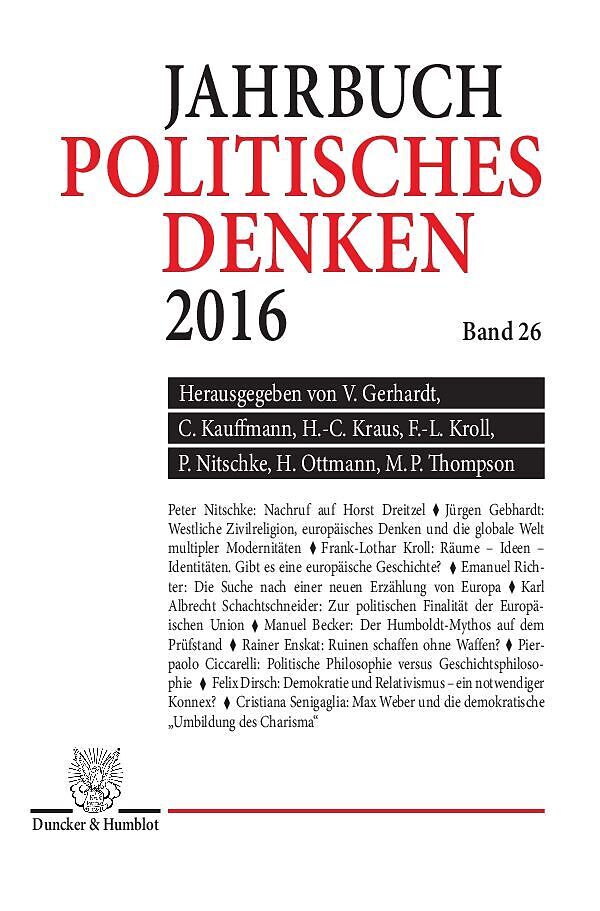 Peter Nitschke Nachruf auf Horst Dreitzel (6. April 193118. März 2016) I. Europa denken Jürgen Gebhardt Westliche Zivilreligion, europäisches Denken und die globale Welt multipler Modernitäten Frank-Lothar Kroll Räume Ideen Identitäten. Gibt es eine europäische Geschichte? Emanuel Richter Die Suche nach einer neuen Erzählung von Europa. Politische und demokratische Potentiale Karl Albrecht Schachtschneider Zur politischen Finalität der Europäischen Union II. Aufsätze Manuel Becker Der Humboldt-Mythos auf dem Prüfstand. Wilhelm von Humboldt als Theoretiker und Praktiker von Bildungs- und Hochschulpolitik Rainer Enskat Ruinen schaffen ohne Waffen? Zu den politischen Widerfahrnissen der Geisteswissenschaften und der Autonomie der Universität Pierpaolo Ciccarelli Politische Philosophie versus Geschichtsphilosophie. Leo Strauss' Interpretation von Husserls »Philosophie als strenge Wissenschaft« Felix Dirsch Demokratie und Relativismus ein notwendiger Konnex? Verfassungsrechtliche und ideengeschichtliche Hintergründe eines viel diskutierten kulturkritischen Topos der Gegenwart Cristiana Senigaglia Max Weber und die demokratische »Umbildung des Charisma« III. Rezensionsessay Hans-Christof Kraus Neues von und über Carl Schmitt IV. Rezensionen