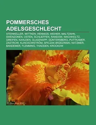 Quelle: Wikipedia. Seiten: 135. Kapitel: Steinkeller, Wittken, Hennigs, Weiher, Maltzahn, Swenzonen, Osten, Schlieffen, Randow, Wachholtz, Greifen, Kahlden, Glasenapp, Güntersberg, Puttkamer, Zastrow, Klinckowström, Spiczak Brzezinski, Natzmer, Bandemer, Flemm...Quelle: Wikipedia. Seiten: 135. Kapitel: Steinkeller, Wittken, Hennigs, Weiher, Maltzahn, Swenzonen, Osten, Schlieffen, Randow, Wachholtz, Greifen, Kahlden, Glasenapp, Güntersberg, Puttkamer, Zastrow, Klinckowström, Spiczak Brzezinski, Natzmer, Bandemer, Flemming, Thadden, Krockow, Stralenheim, Dossow, Kirchbach, Rotermund, Münchow, Dewitz, Zeromski-Brochwicz, Freiherren von Langen, Schwerin, Jutrzenka, Kleist, Podewils, Mellin, Massow, Wopersnow, Suhm, Manteuffel, Samboriden, Neuenkirchen, Kameke, Wobeser, Heyden, Lettow-Vorbeck, Schmeling, Somnitz, Mitzlaff, Putbus, Borcke, Lepel, Gottberg, Normann, Redern, Wedel, Below, Lancken, Wolf von Goddenthow, Yorck von Wartenburg, Hechthausen, Malotki, Pirch, Bohlen, Wackenitz, Smuda, Gagern, Mellenthin, Zitzewitz, Eberstein-Naugard, Nettelhorst, Quistorp, Köller, Bonin, Jasmund, Ramin, Wnuck, Usedom, Schaetzel, Barnekow, Krakewitz, Ramel, Zozenow, Linden, Schöning, Hertzberg, Haselberg, Krassow, Wolde, Horn, Owstin, Eickstedt, Boehn, Blixen, Gristow, Schwawe, Heydebreck, Brederlow, Mörder, Tauentzien, Bastian Brzezinski, Versen, Vangerow, Grumbkow, Ploetz, Ahnen, Stojentin, Boltenstern, Hagenow, Lindequist, Woedtke. Auszug: Steinkeller, auch Steynkeller, Stenkelre oder Stenkeller, ist der Name eines alten mecklenburgisch-pommerschen Adelsgeschlechts. Das Geschlecht erscheint urkundlich erstmals am 11. November 1355 mit Wolder von Steinkeller und seinen Söhnen Konrad und Alard und Wolder. Die Familie war in Vor- und Hinterpommern und im schwedischen Pommern, dem späteren Regierungsbezirk Stralsund, sowie in der Mark Brandenburg ansässig. In der Mark waren sie u. a. mit Bahrensdorf, Krügersdorf (Kriegersdorf) und Görsdorf begütert. Wolter vom Steinkeller war Einwohner von Parchim im Jahre 1384. Er hatte Besitz in Stralendorf, welchen er an seine Söhne Alhard und Konrad vererbte. Die Familie von Langenn-Steinkeller, welche vor allem in der Neumark begütert war, ging aus ihnen hervor. Wappen der pommerschen Linie Auf einem blauen Schild im Schildesfuß ein rotes Herz, in welchem drei Degen, der eine senkrecht, der andere schräg rechts und der dritte schräg links, mit den Spitzen stecken. Auf dem gekrönten Helm drei doppelte blaue Lilien, so gestellt, wie die Schwerter im Schild. Die Helmdecken sind blau und rot. Bei Johann Siebmacher ist das pommersche Wappen 1701 ebenso, nur die Lilien blau, silbern und blau, die Helmdecken blau und silbern. Erwähnung des Hans Stenkelre, 1465 zu Pantelitz (Pantlitz), Kreis Franzburg. Hans von Steinkeller, seit 1479 Herr auf Pantelitz, befand sich unter den 300 Rittern, welche den Herzog Bogislaw X. von Pommern von 1496 bis zu ihrer Rückkehr 1498 auf dem Zug in das Heilige Land begleiteten. Thomas Steinkeller, Erbgesessener zu Pantelitz im Jahre 1523. Das Patronat endete 1660 in Pantelitz. In der Mitte des 17. Jahrhunderts teilte sich durch die Brüder Ernst und Philipp von Steinkeller die Familie in zwei Linien. Ernst von Steinkeller, welcher die Güter Krügersdorf, Görsdorf und Birkholz kaufte und den dort bis dahin belehnten Familienzweigen erblich stiftete (krügersdorf-birkholzsche Linie), und Philipp von Steinkeller auf Wiepkenhagen, Begründer der rötzen