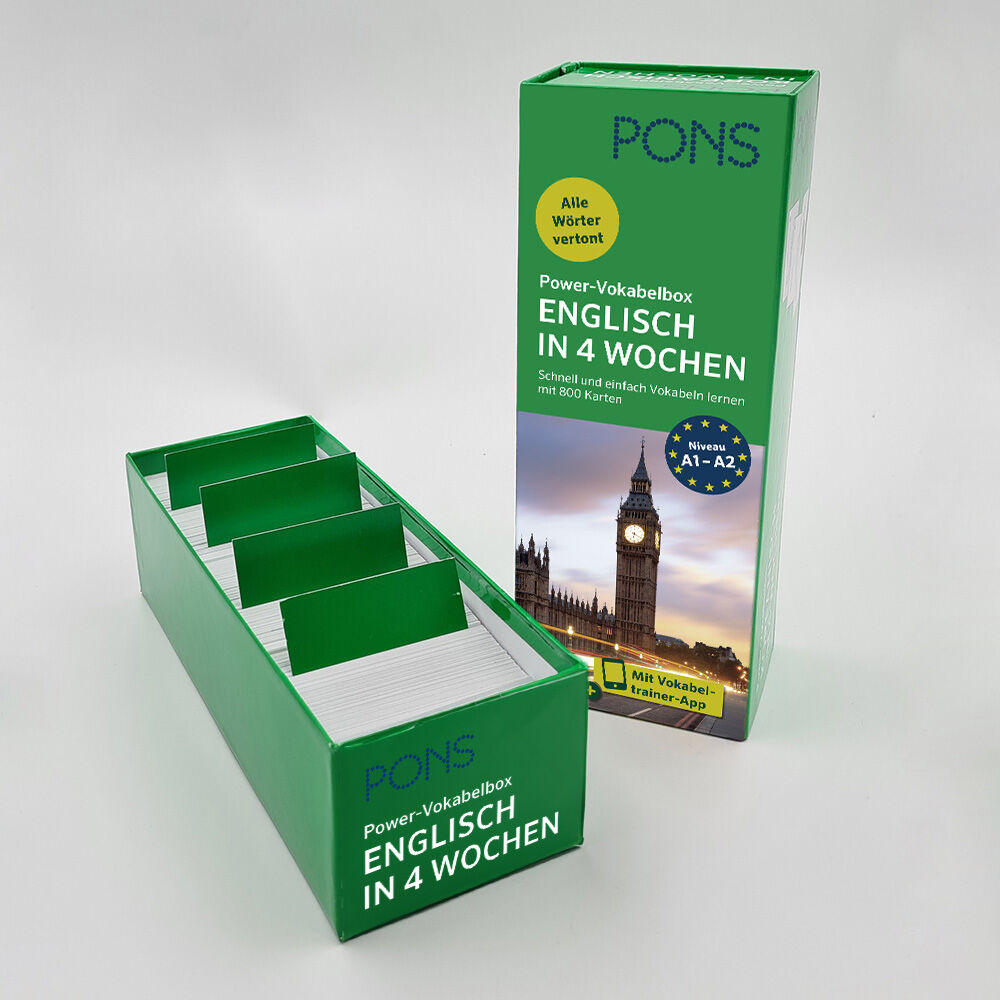 Englisch in 4 Wochen: Schnell Englisch-Vokabeln lernen mit der 5-Fächer-Methode 800 thematisch sortierte Vokabelkarten mit 1.500 Vokabeln, Wendungen und Beispielsätzen Mit der bewährten 5-Fächer-Methode für Ihren Lernerfolg 100 Bildkarten mit wichtigen Wörter...