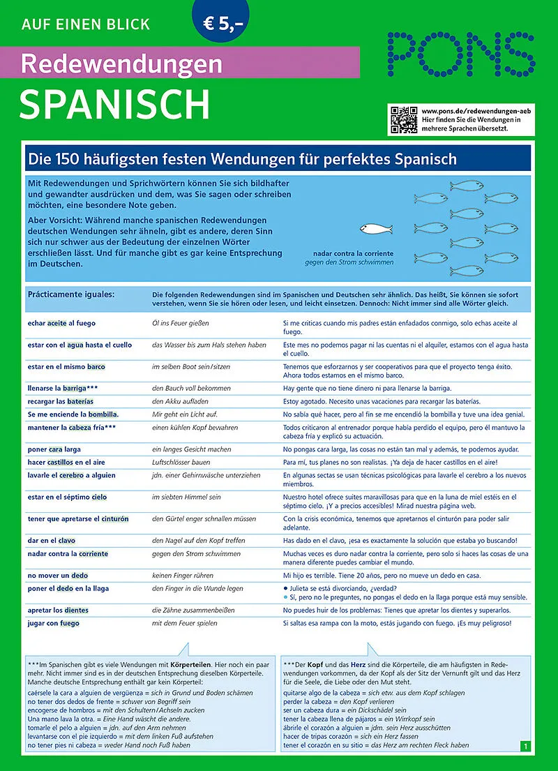 Die kompakte Übersicht zu spanischen Redewendungen: Die wichtigsten Redewendungen mit Übersetzung und Beispielen für authentisches Spanisch . Inklusive Tipps und Hinweisen zu Herkunft, Gebrauch und Besonderheiten. Immer griffbereit: Liste mit Redewendungen in...