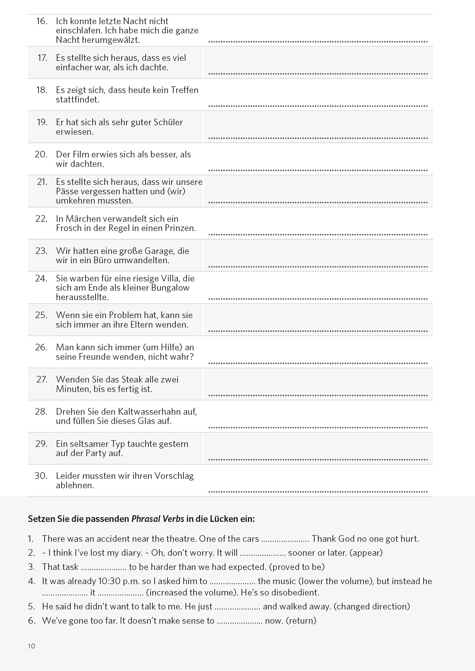 Die englischen Phrasal Verbs in lebendiger Sprache üben Lernen Sie die englischen Phrasal Verbs einfach und schnell , indem Sie übersetzen Für alle, die die Phrasal Verbs sicher und kompetent anwenden wollen Übersetzen Sie authentische, lebendige Sätze aus de...