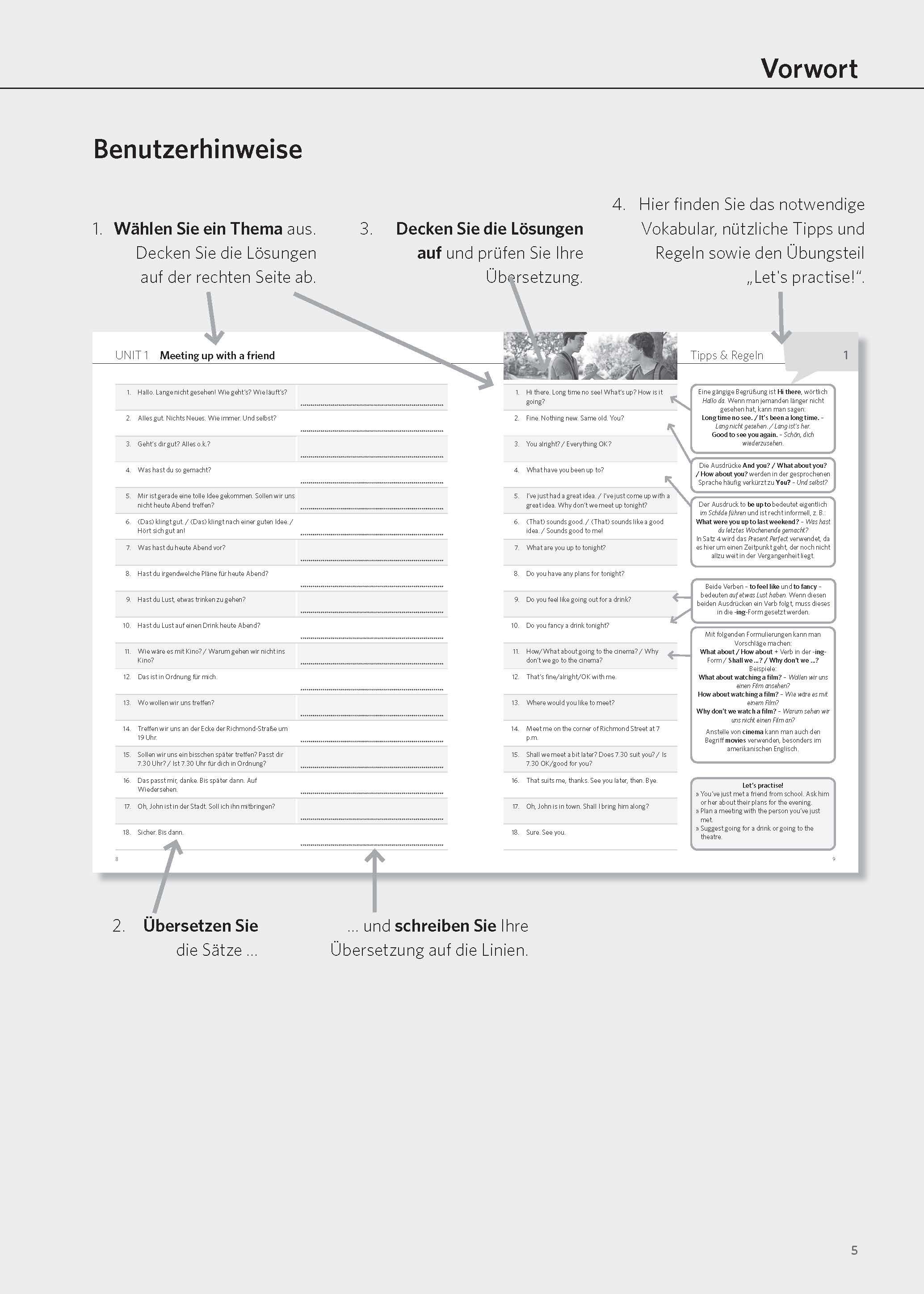 Englisch sprechen lernen in Alltagssituationen Gewinnen Sie Selbstvertrauen im täglichen Umgang mit der englischen Sprache. Übersetzen Sie authentische, lebendige Sätze aus dem Alltag, wie z. B. Freunde treffen, beim Check-in am Flughafen, im Restaurant, beim...