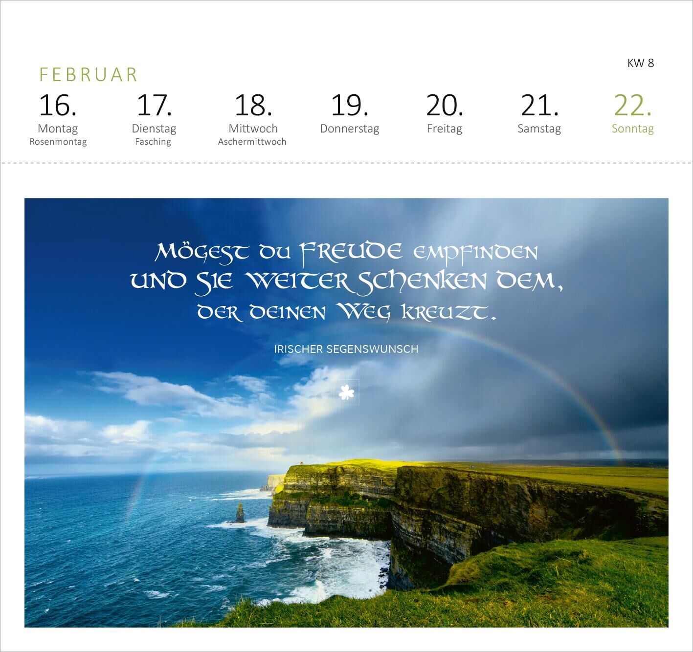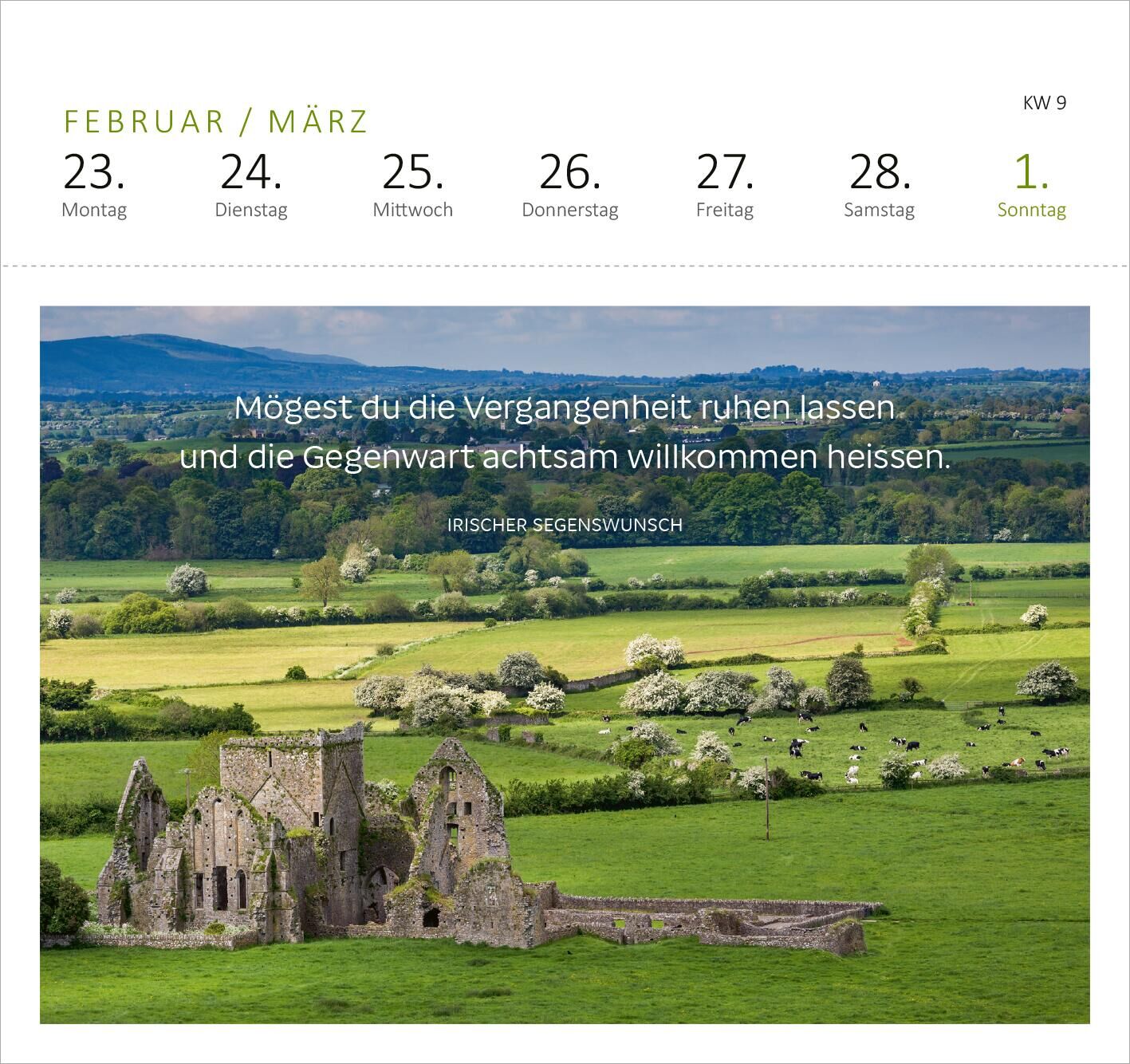 Tischkalender zum Aufstellen schenkt irische Sehnsuchtsmomente für zu Hause Dieser Wochenkalender entführt dich auf die Grüne Insel und inspiriert jeden Tag mit Segenswünschen und Lebensweisheiten aus dem wunderschönen Irland. Jede Postkarte zeigt traumhafte,...