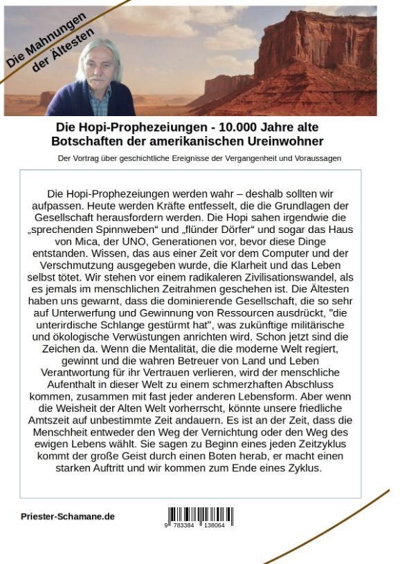 Die Hopi-Prophezeiungen - 10.000 Jahre alte Botschaften der amerikanischen Ureinwohner Der Vortrag über geschichtliche Ereignisse der Vergangenheit und Voraussagen Die Hopi-Prophezeiungen werden wahr deshalb sollten wir aufpassen. Heute werden Kräfte entfessel...