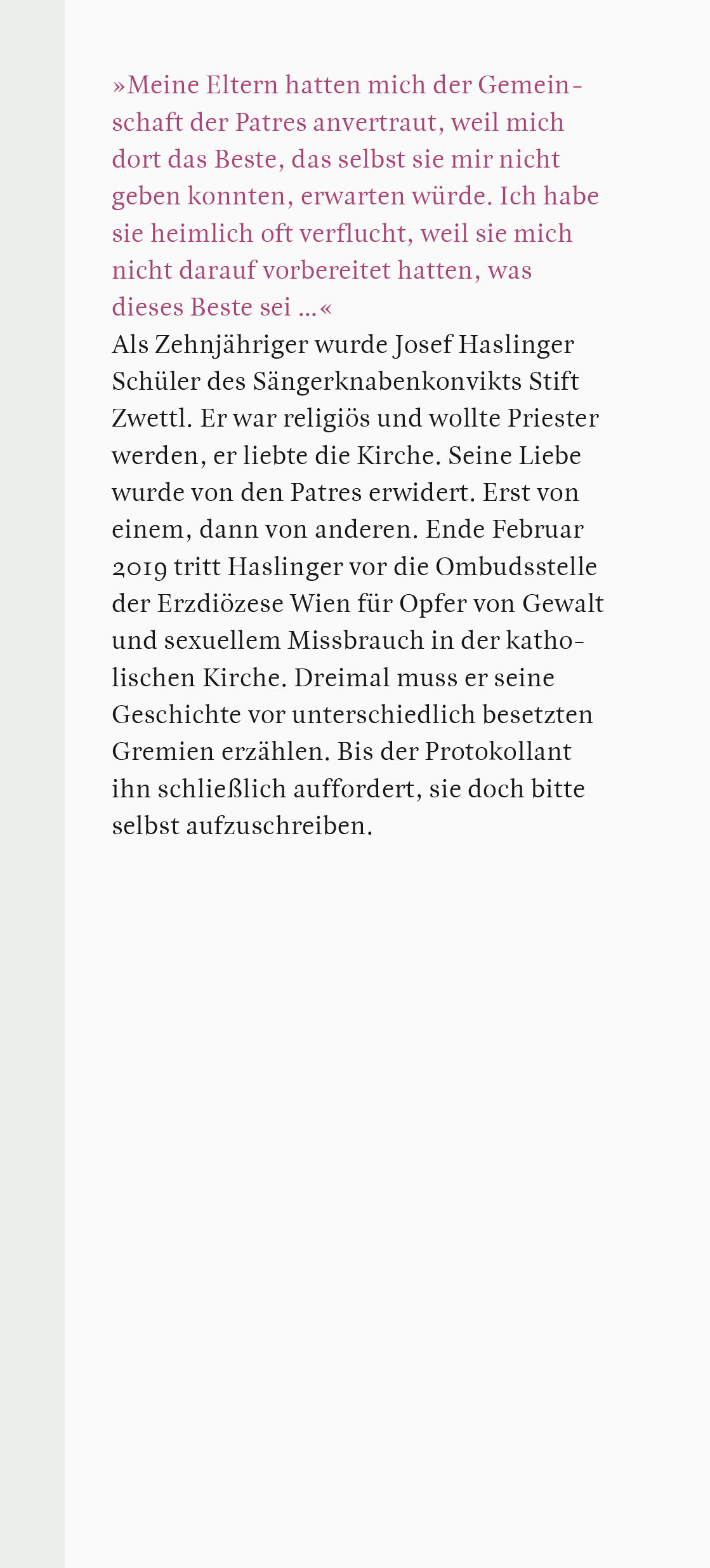 »Nie habe ich von Pater G. erzählt, aus Angst, man könne mir anmerken, dass ich sein Kind geblieben bin.« »Meine Eltern hatten mich der Gemeinschaft der Patres anvertraut, weil mich dort das Beste, das selbst sie mir nicht geben konnten, erwarten würde. Ich ha...