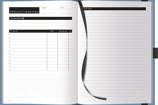 ·Notizbuch DIN A5 (14,8 x 21 cm)) · 200 Seiten ·100 g umweltfreundliches FSC Papier ·Nachhaltig mit veganen Materialien produziert ·In edler Leinenstruktur mit Farbschnittkante ·1 Lesebändchen, Stiftehalter und Gummiband Organisiere Projekte und Meetings mühe...
