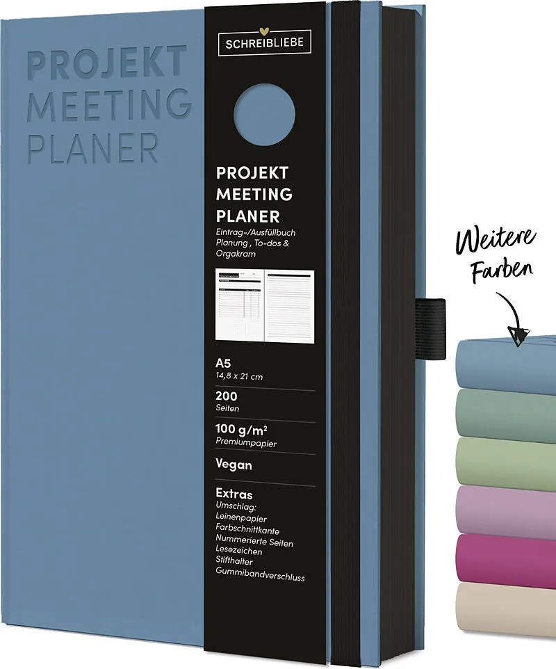 ·Notizbuch DIN A5 (14,8 x 21 cm)) · 200 Seiten ·100 g umweltfreundliches FSC Papier ·Nachhaltig mit veganen Materialien produziert ·In edler Leinenstruktur mit Farbschnittkante ·1 Lesebändchen, Stiftehalter und Gummiband Organisiere Projekte und Meetings mühe...