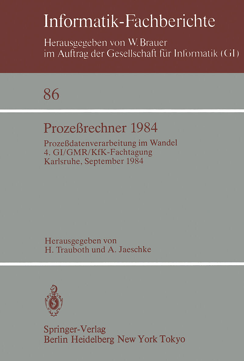 Die Fachtagung IProzeSrechner" wurde vor 10 Jahren durch die Gesellschaft fiir Infor matik (GI), Gesellschaft fiir MeS- und Regelungstechnik (GMR) und dem Kernforschungs zentrum Karlsruhe (KfK) gemeinsam ins Leben gerufen und das erste Mal von der KfK in ...Die Fachtagung IProzeSrechner" wurde vor 10 Jahren durch die Gesellschaft fiir Infor matik (GI), Gesellschaft fiir MeS- und Regelungstechnik (GMR) und dem Kernforschungs zentrum Karlsruhe (KfK) gemeinsam ins Leben gerufen und das erste Mal von der KfK in Karlsruhe ausgerichtet. Seither hat sich auf dem Gebiet der ProzeSdatenverarbeitung (PDV) ein technologischer Wandel vollzogen. Es wird heute eine Vielzahl von Systemkom ponenten und Rechnerarchitekturen angeboten, die eine starkere Integration der Daten verarbeitung mit der Nachrichtentechnik und ProzeSinstrumentierung erlauben. An die Stelle von Einzellasungen mit einem selbstandigen ProzeSrechner treten nun zunehmend umfassende Systemlasungen, bei denen ProzeSdatenverarbeitungssysteme die gesamte In formationsverarbeitung einer technischen Anlage oder eines Gerats iibernehmen. AuSer dem werden neuartige Anwendungsbereiche eraffnet und hahere Zuverlassigkeit, Wirt schaftlichkeit und Flexibilitat gefordert. Dieser Wandel findet auch in der Tagung 1984 seinen Niederschlag, wobei vor allem die Sicht des Anwenders im Vordergrund steht. Die Erfahrungen und der Nutzen des unter schiedlichen Einsatzes der ProzeSdatenverarbeitung in weiten Bereichen der Industrie, des Dienstleistungsgewerbes und der Forschung sowie des Einsatzes von Methoden und Werkzeugen zur Entwicklung, Qualitatssicherung und Projektabwicklung werden dargelegt und diskutiert.