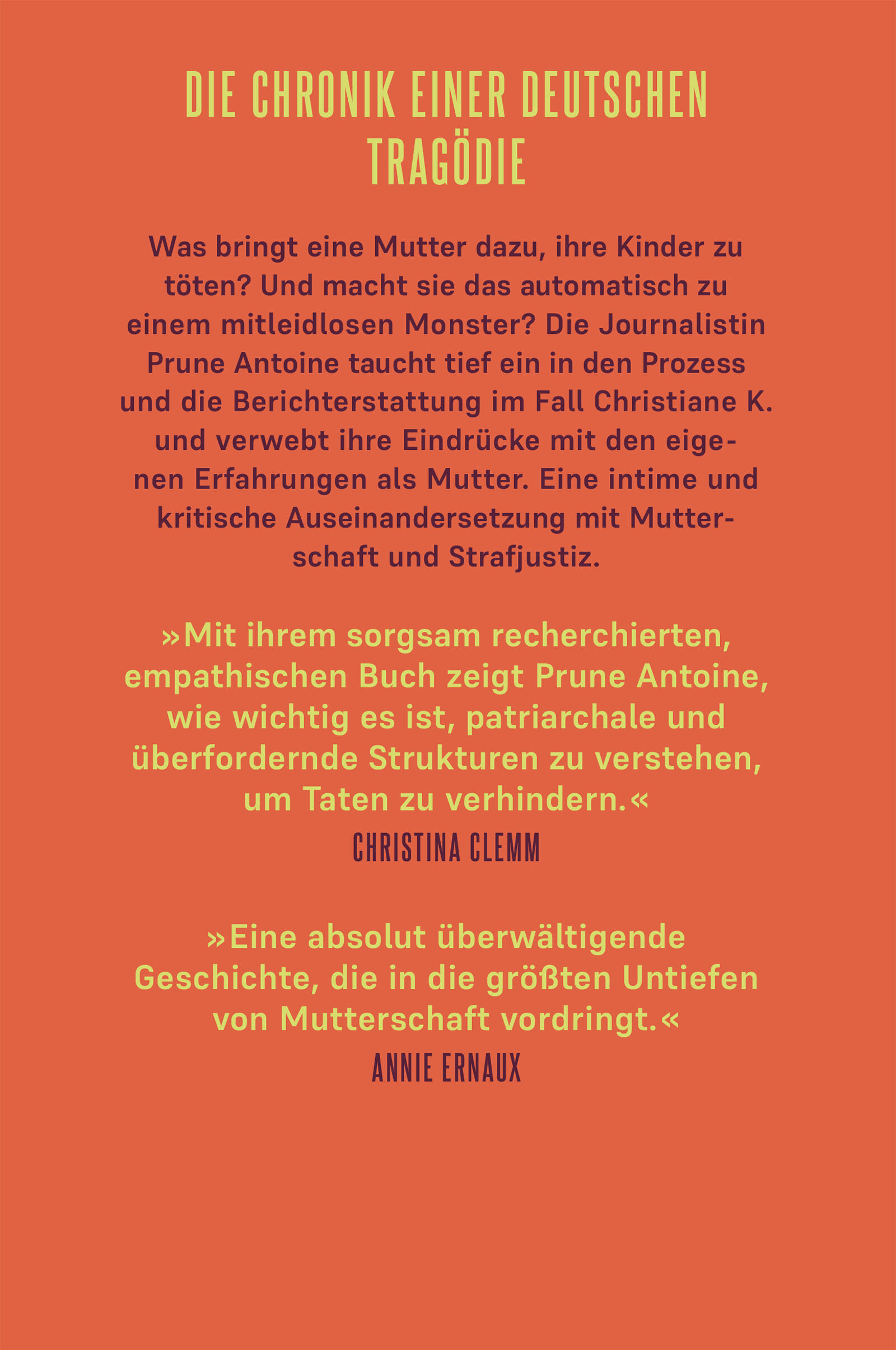 »Eine überwältigende Geschichte, die in die größten Untiefen von Mutterschaft vordringt.« Annie Ernaux Solingen, 2020. Christiane K. ist 27 Jahre alt, als sie fünf ihrer sechs Kinder umbringt und sich dann vor einen Zug wirft. Sie überlebt. Prune Antoine, eine...