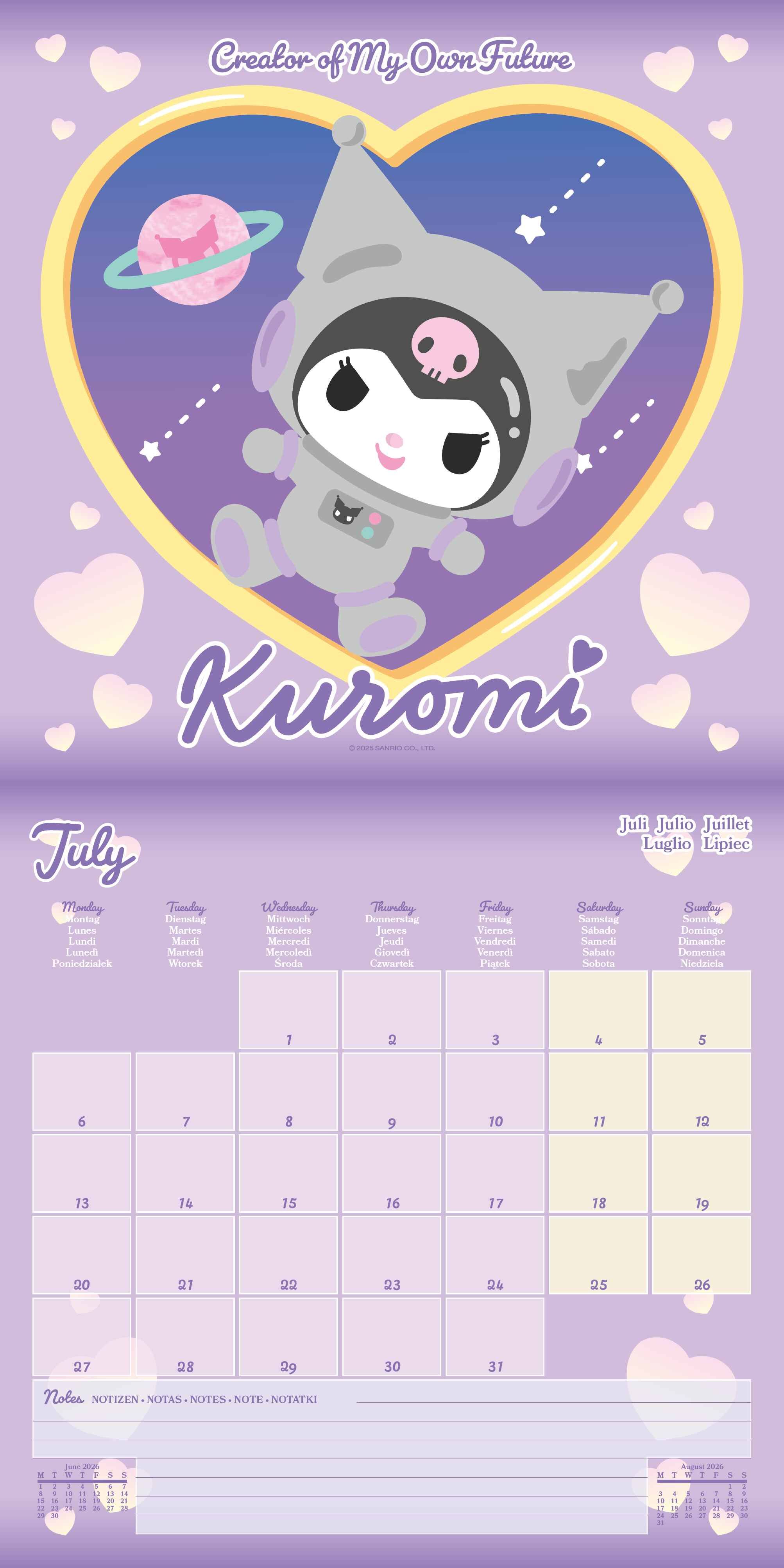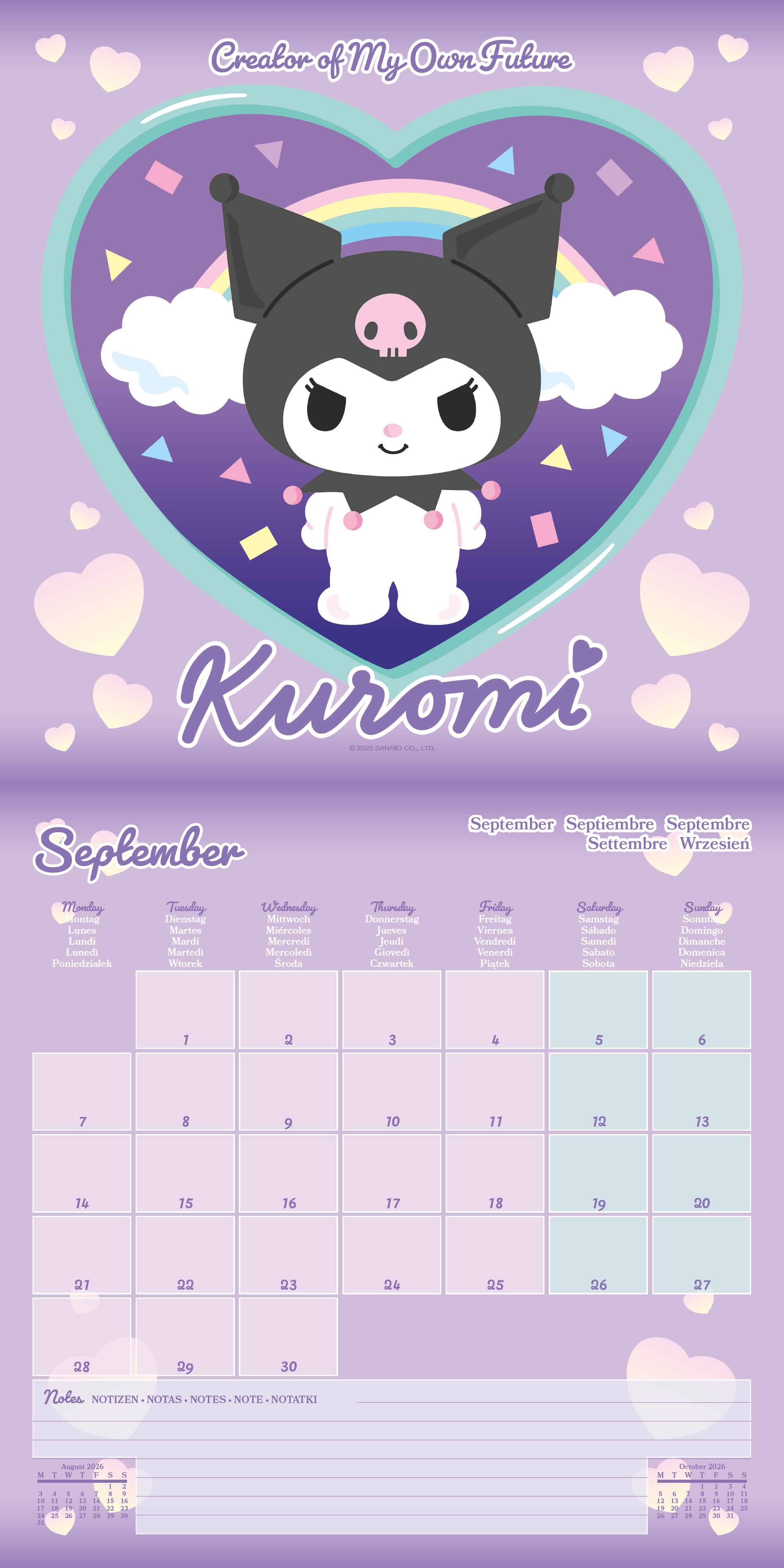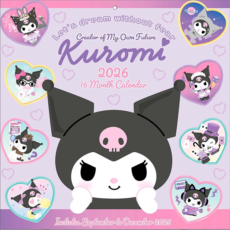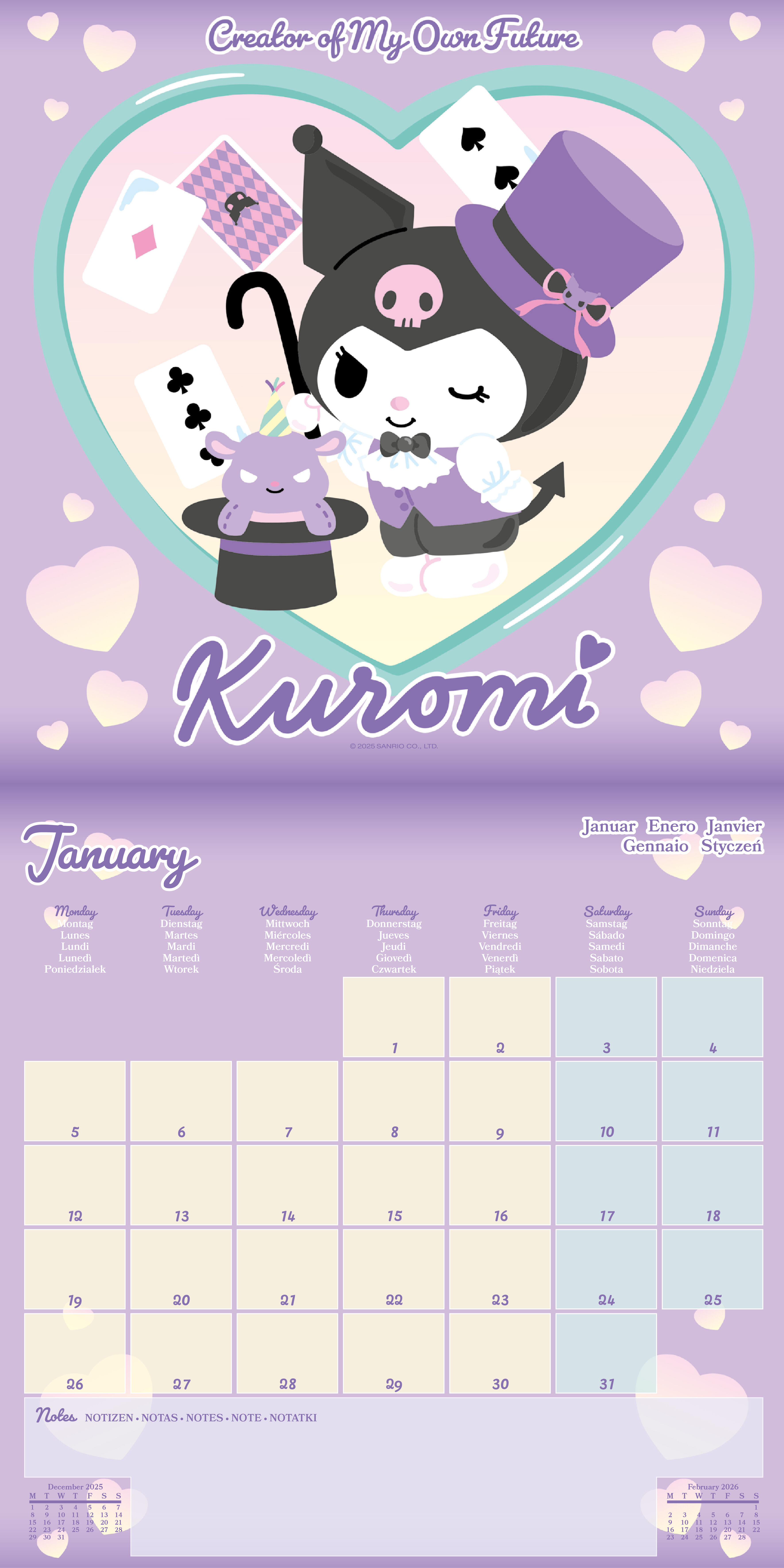 Der KUROMI 2026 Broschürenkalender von Pyramid Europe (30 × 30 cm, aufgeklappt 30 × 60 cm) bringt die freche und verspielte Freundin von My Melody in dein Zuhause. Mit 12 niedlich-frechen Motiven vereint er Attitüde, Kawaii-Charme und Sanrio-Magie ein Highlig...