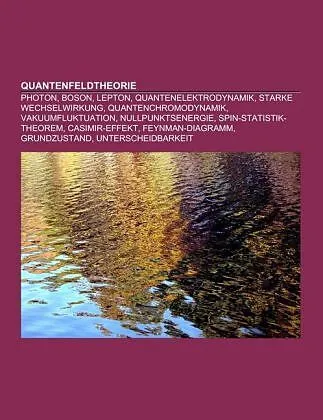 Quelle: Wikipedia. Seiten: 98. Kapitel: Photon, Boson, Lepton, Quantenelektrodynamik, Starke Wechselwirkung, Quantenchromodynamik, Vakuumfluktuation, Nullpunktsenergie, Spin-Statistik-Theorem, Casimir-Effekt, Feynman-Diagramm, Grundzustand, Unterscheidbarkeit,...Quelle: Wikipedia. Seiten: 98. Kapitel: Photon, Boson, Lepton, Quantenelektrodynamik, Starke Wechselwirkung, Quantenchromodynamik, Vakuumfluktuation, Nullpunktsenergie, Spin-Statistik-Theorem, Casimir-Effekt, Feynman-Diagramm, Grundzustand, Unterscheidbarkeit, Erzeugungs- und Vernichtungsoperator, Störungstheorie, Schleifenquantengravitation, Kopplungskonstante, Renormierungsgruppe, Spinor, Zweite Quantisierung, Axiomatische Quantenfeldtheorie, Kohärenter Zustand, Dyson-Schwinger-Gleichungen, Hawking-Strahlung, Vakuumenergie, Kritisches Phänomen, Twistor-Theorie, Yang-Mills-Theorie, Flavour, Gittereichtheorie, Eichboson, Wick-Rotation, Wahrscheinlichkeitsstromdichte, Holografisches Prinzip, CPT-Theorem, Vakuumpolarisation, Pfadintegral, Bethe-Salpeter-Gleichung, Propagator, FQFT, Selbstenergie, Gebundener Zustand, Zitterbewegung, Streutheorie, Chirale Symmetrie, Bornsche Näherung, Schwingers Quantenwirkungsprinzip, Virtuelles Teilchen, Farbsupraleitung, Observable, Primonengas, Anyon, Delbrück-Streuung, Einstein-de-Haas-Effekt, Quantengeometrie, Wilson-Loop, Strangeness, Ladungskonjugation, Tetronmodell, Drell-Yan-Prozess, Lamb-Verschiebung, Nielsen-Ninomiya-Theorem, Fockraum, Gell-Mann-Matrizen, Pinguin-Diagramm, Feynman-Parametrisierung, S-Matrix, Konforme Feldtheorie, Reeh-Schlieder-Theorem, Spin-Schaum, Fermi-Wechselwirkung, Faddejew-Popow-Geister, Dyson-Gleichung, Unruh-Effekt, Reiner Zustand, Asymptotische Freiheit, Sattelpunktsnäherung, Fano-Resonanz, Infrarotproblem, Hyperladung, Coleman-Mandula-Theorem, Haag-Lopuszanski-Sohnius-Theorem, Fock-Zustand, Ward-Identität, Instanton, Eightfold Way, Domain-Wall-Fermion, Spin-Netzwerk, LSZ-Reduktionsformel, Kritisches Feld, Callan-Symanzik-Gleichung. Auszug: Die Quantenfeldtheorie (QFT) ist ein Gebiet der theoretischen Physik, in dem Prinzipien klassischer Feldtheorien (zum Beispiel der Elektrodynamik) und der Quantenmechanik zur Bildung einer erweiterten Theorie kombiniert werden. Spezielle Theorien, die bestimmte physikalische Systeme mit den Methoden der Quantenfeldtheorie behandeln, werden als Quantenfeldtheorien bezeichnet. Die Quantenfeldtheorie geht über die Quantenmechanik hinaus, indem sie Teilchen und Felder einheitlich beschreibt. Dabei werden nicht nur sog. Observable (also beobachtbare Größen wie Energie oder Impuls) quantisiert, sondern auch die wechselwirkenden (Teilchen-)Felder selbst; die Felder werden also ähnlich wie Observable behandelt. Die Quantisierung der Felder bezeichnet man auch als Zweite Quantisierung. Diese berücksichtigt explizit die Entstehung und Vernichtung von Elementarteilchen (Paarerzeugung, Annihilation). Die Methoden der Quantenfeldtheorie kommen vor allem in der Elementarteilchenphysik und in der statistischen Mechanik zur Anwendung. Man unterscheidet dabei zwischen relativistischen Quantenfeldtheorien, die die spezielle Relativitätstheorie berücksichtigen und häufig in der Elementarteilchenphysik Anwendung finden, und nicht-relativistischen Quantenfeldtheorien, die beispielsweise in der Festkörperphysik relevant sind. Die Objekte und Methoden der QFT sind physikalisch motiviert, auch wenn viele Teilbereiche der Mathematik zum Einsatz kommen. Die Axiomatische Quantenfeldtheorie versucht dabei, Grundlagen und Konzepte in einen mathematisch rigorosen Rahmen zu fassen. Die Quantenfeldtheorien sind Weiterentwicklungen der Quantenphysik über die Quantenmechanik hinaus. Die vorher existierenden Quantentheorien waren ihrem Aufbau nach Theorien für System...