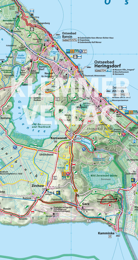 Die Insel Usedom bietet reichlich Strand und ein reizvolles Hinterland. Strahlende Seebäder, verträumte romantische Dörfer, Wiesen und Wald laden zum Besuch ein. Unsere Karte bildet die gesamte Insel einschließlich Misdroy ab und gibt ausgewählte Erlebnistipps...