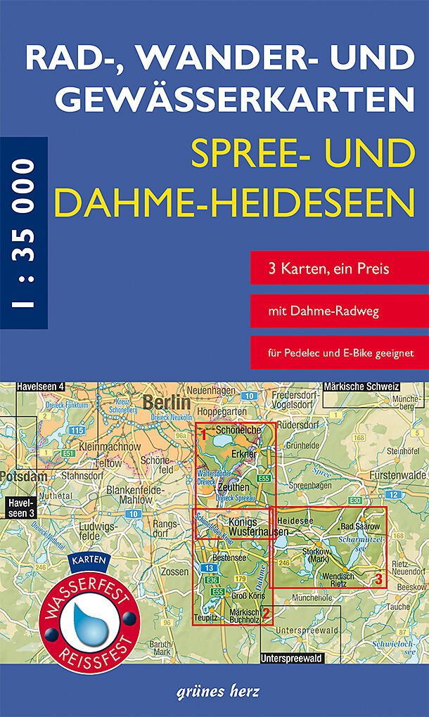 Die drei Karten Dahme-Spree: Köpenick, Erkner, Königs-Wusterhausen, Dahme-Seen: Königs-Wusterhausen, Teupitz und Storkower Gewässer: Scharmützelsee erscheinen als praktisches Kartenset und decken das Gebiet von Köpenick, dem Westufer des Motzener Sees, Königs-...