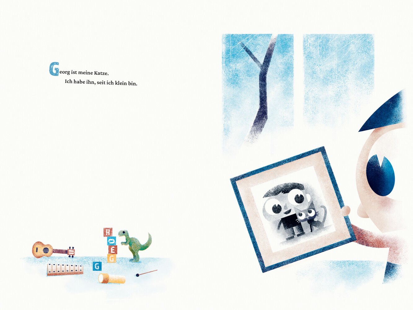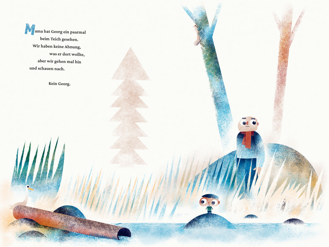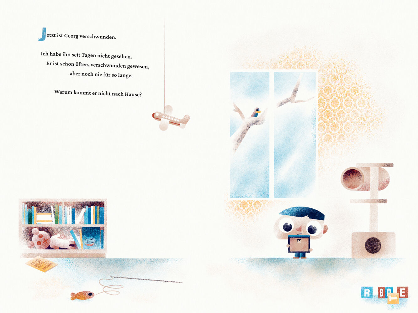 Kater Georg ist verschwunden. Seit Tagen schon. Zusammen mit seinem Vater macht der junge Ich-Erzähler sich auf die Suche nach ihm bei den Nachbarn, hinter dem Haus und am kleinen See. Aber Georg ist nirgends zu finden. Dann das: ein roter Fleck auf der Straß...
