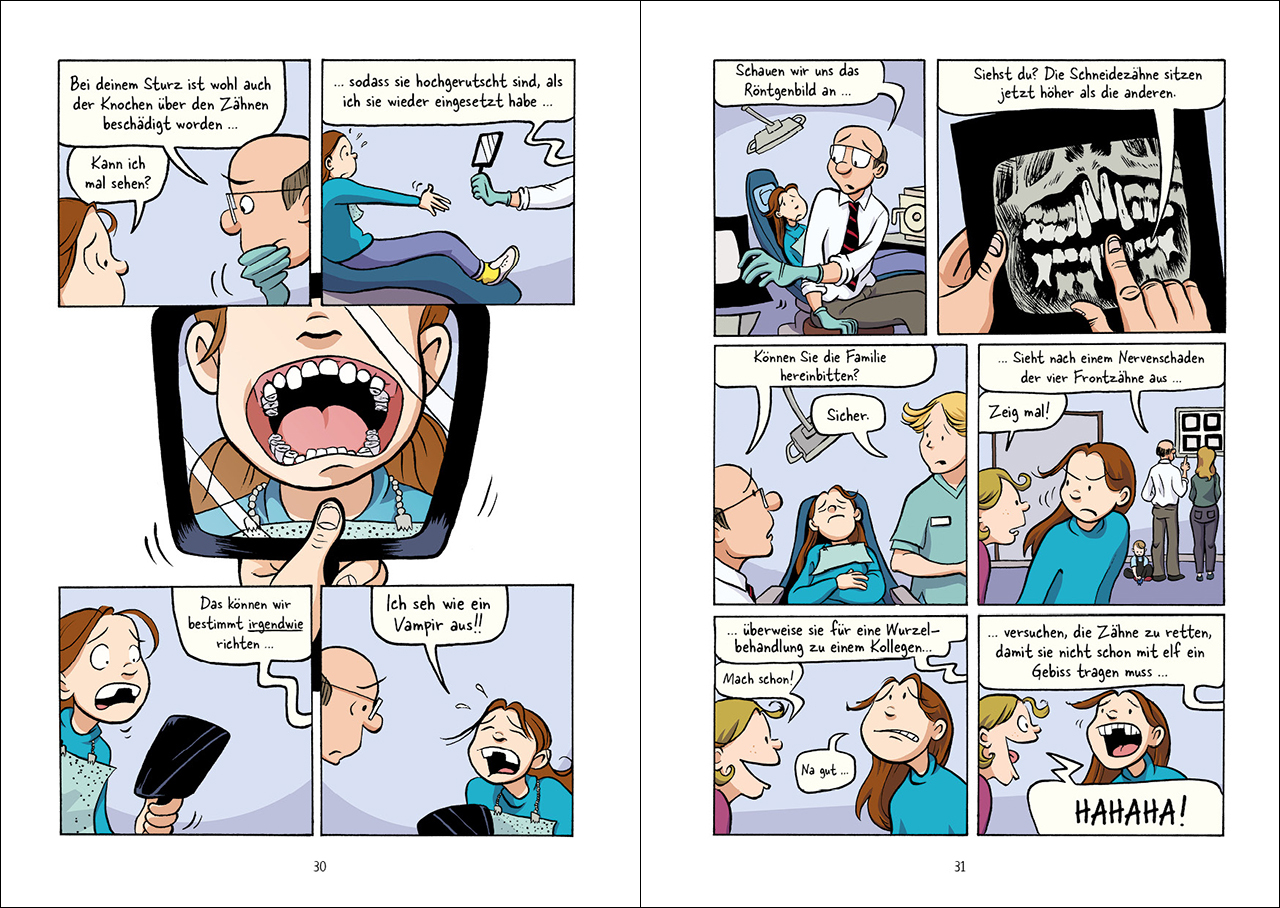 Wer lächelt, zeigt Zähne. Nur bei Raina klafft eine riesige Lücke, wo früher ihre Schneidezähne waren. Seit ihrem Unfall trägt sie eine peinliche Zahnspange. Und immer wieder muss sie zum Zahnarzt, zum Chirurgen, zum Kieferorthopäden. Da kann einem das Lachen schon einmal vergehen. Als ob sie sonst keine Probleme hätte! Pickel zum Beispiel. Und Jungs. Wie gut, dass sie an der neuen Schule wenigstens echte Freundinnen findet. Und am Ende auch wieder lachen kann.