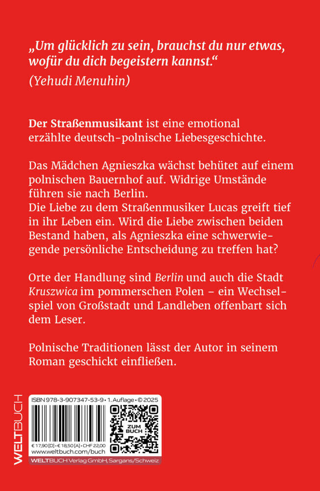 Um glücklich zu sein, brauchst du nur etwas, wofür du dich begeistern kannst. (Yehudi Menuhin) Der Straßenmusikant ist eine emotional erzählte deutsch-polnische Liebesgeschichte. Das Mädchen Agnieszka wächst behütet auf einem polnischen Bauernhof auf. Widrige ...
