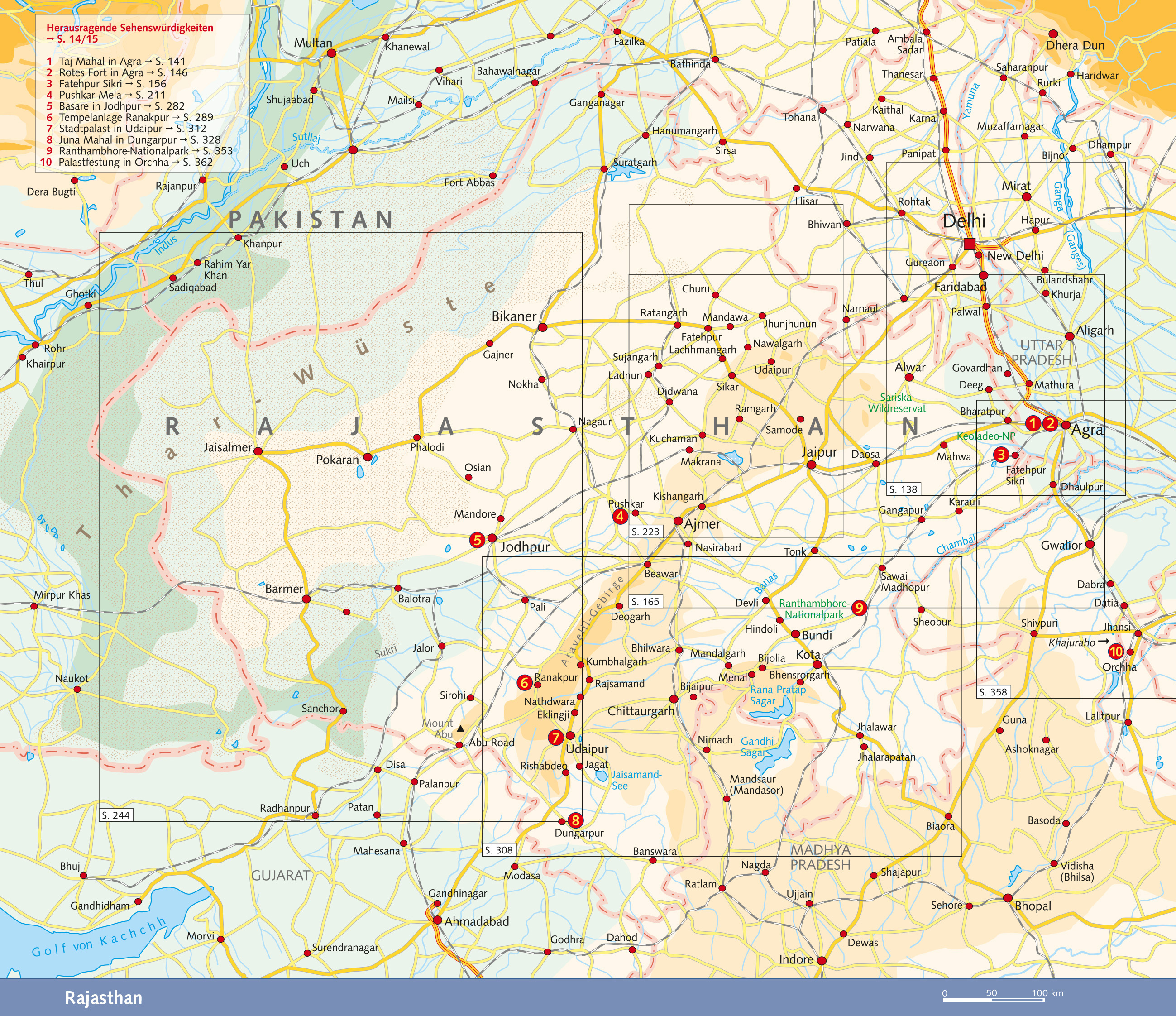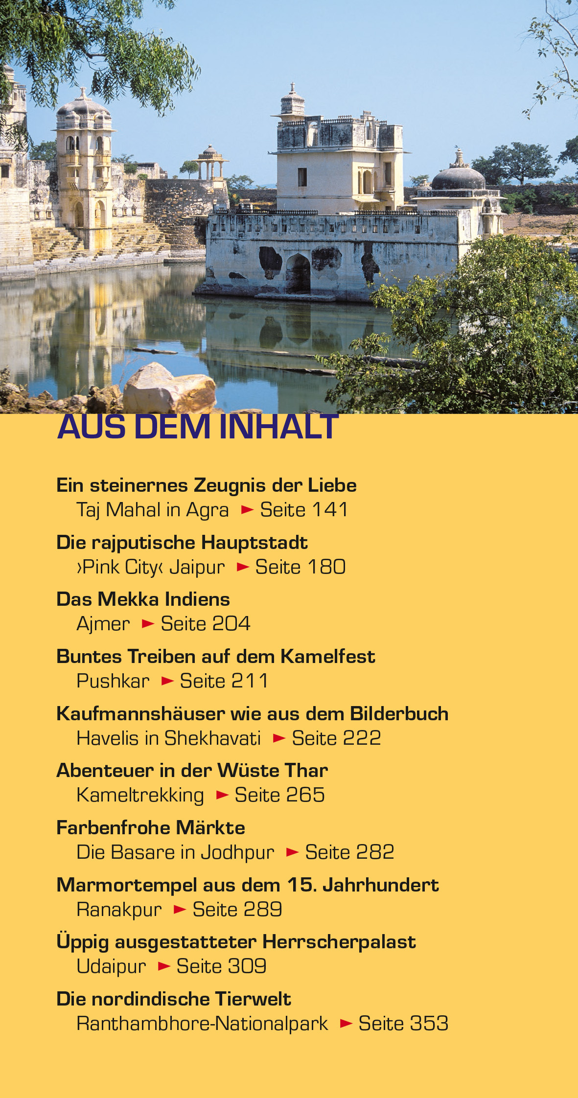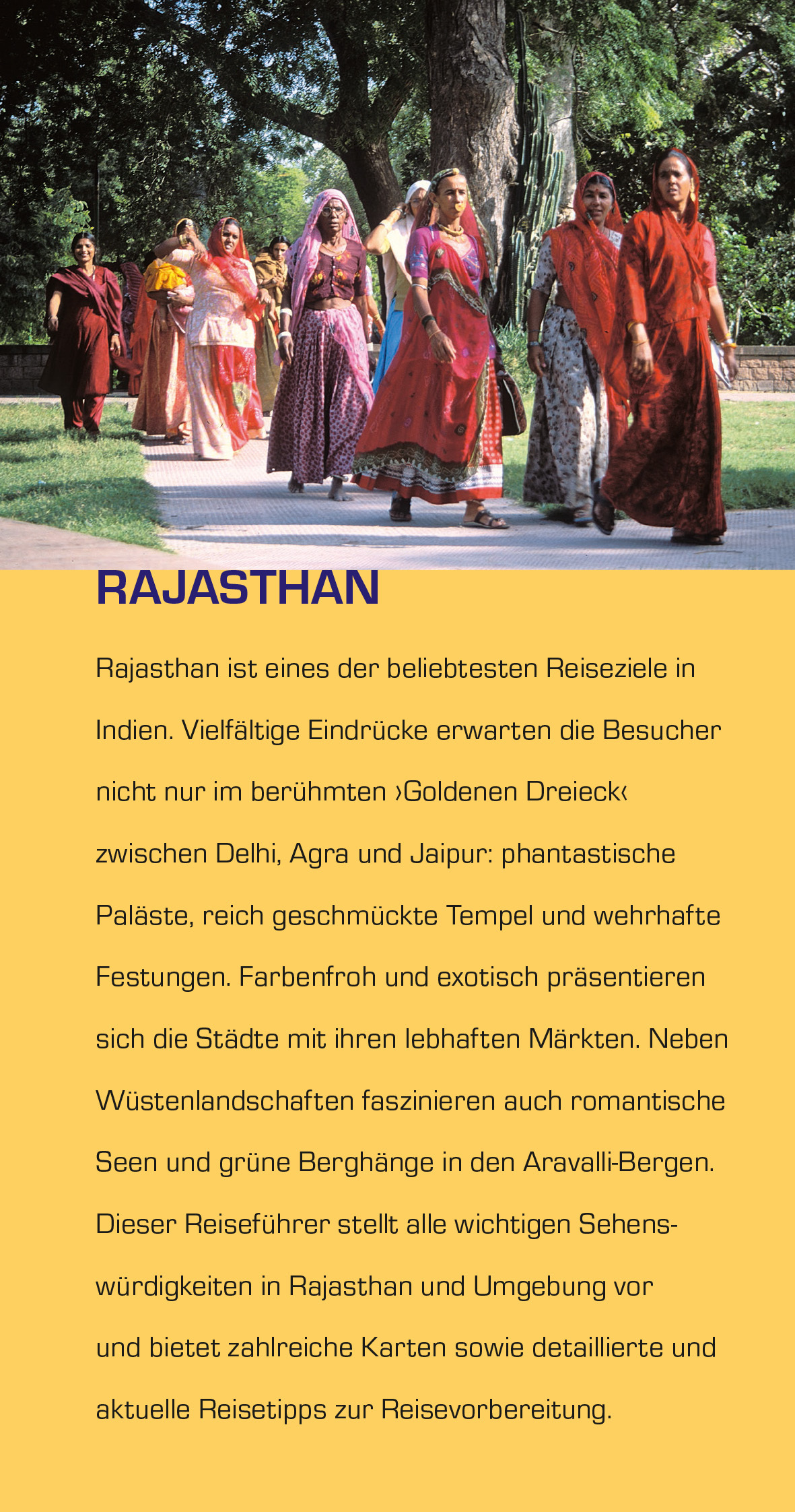 Seite 141 DIE RAJPUTISCHE HAUPTSTADT Pink City Jaipur > Seite 180 DAS MEKKA INDIENS Ajmer > Seite 204 BUNTES TREIBEN AUF DEM KAMELFEST Pushkar > Seite 211 KAUFMANNSHÄUSER WIE AUS DEM BILDERBUCH Havelis in Shekhavati > Seite 222 ABENTEUER IN DER WÜSTE THAR Kameltrekking > Seite 265 FARBENFROHE MÄRKTE Die Basare in Jodhpur > Seite 282 MARMORTEMPEL AUS DEM 15. JAHRHUNDERT Ranakpur > Seite 289 ÜPPIG AUSGESTATTETER HERRSCHERPALAST Udaipur > Seite 309 DIE NORDINDISCHE TIERWELT Ranthambhore-Nationalpark > Seite 353 Rajasthan ist eines der beliebtesten Reiseziele in Indien. Vielfältige Eindrücke erwarten die Besucher nicht nur im berühmten Goldenen Dreieck zwischen Delhi, Agra und Jaipur: phantastische Paläste, reich geschmückte Tempel und wehrhafte Festungen. Farbenfroh und exotisch präsentieren sich die Städte mit ihren lebhaften Märkten. Neben Wüstenlandschaften faszinieren auch romantische Seen und grüne Berghänge in den Aravalli-Bergen. Dieser Reiseführer stellt alle wichtigen Sehenswürdigkeiten in Rajasthan und Umgebung vorund bietet zahlreiche Karten sowie detaillierte und aktuelle Reisetipps zur Reisevorbereitung. >>> Weitere Reiseführer zu Asien finden sie auf www.trescher-verlag.de