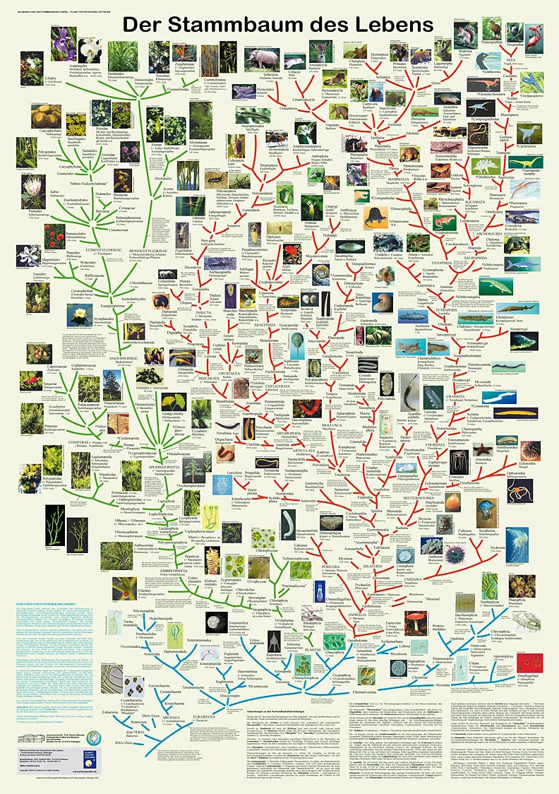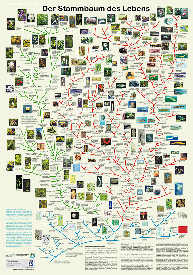 Eine Übersicht über die verwandtschaftlichen Beziehungen der Organismen im gesamten Organismenreich. Die Pflanzen sind mit grünen Verwandtschaftslinien dargestellt, die ursprünglichen Gruppen (Bakterien, Archaeen, ursprüngliche Einzeller, Kieselalgen und Braun...