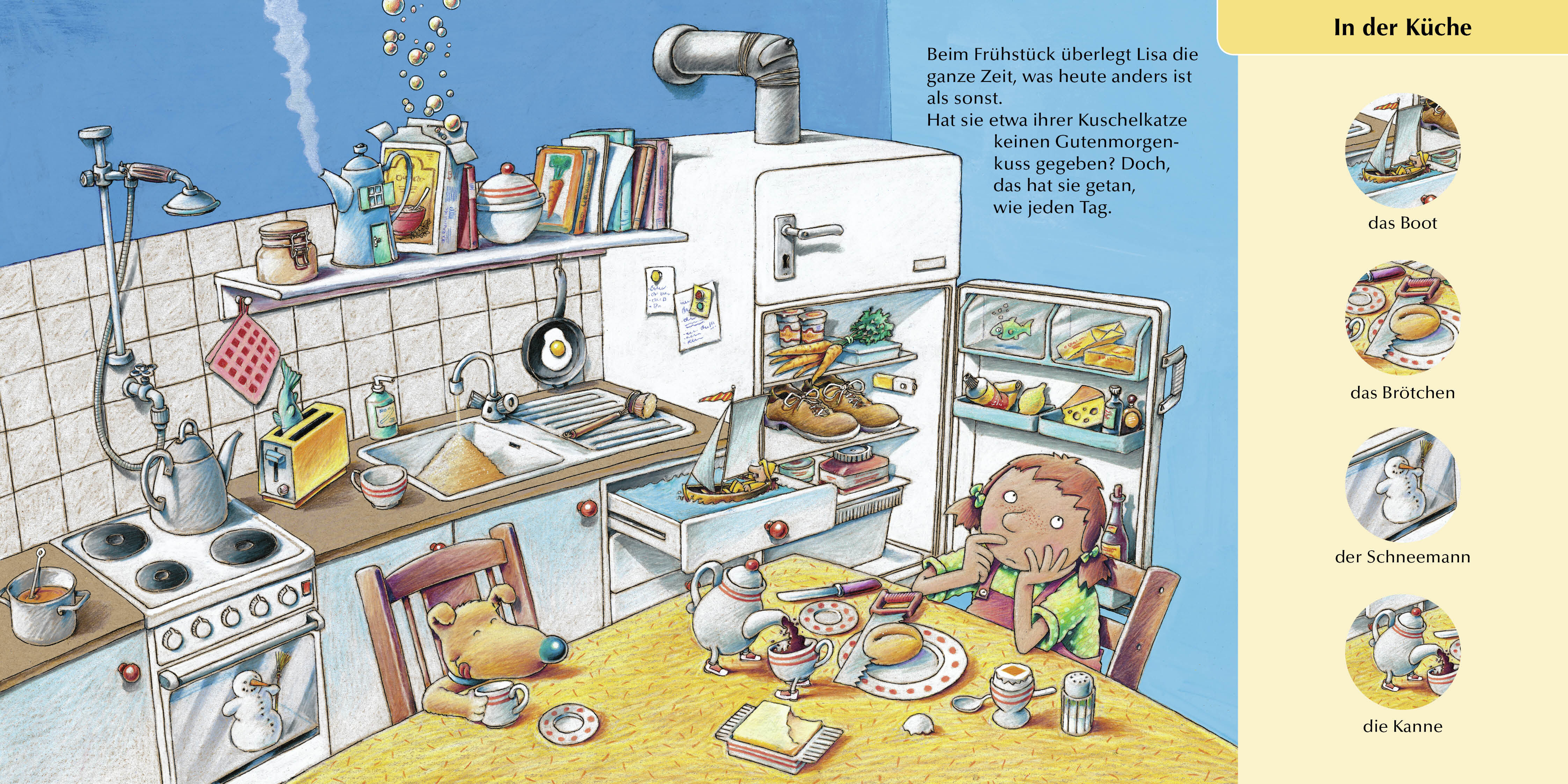 Gleich am Morgen hat Lisa das Gefühl: Heute stimmt was nicht. Aber was ist es bloß? Lisa kommt einfach nicht dahinter. Dabei wimmelt es um sie herum von verrückten Dingen. Da steht ein Schneemann im Backofen, auf Lisas Lieblingsrutsche sitzt ein Löwe und im E...