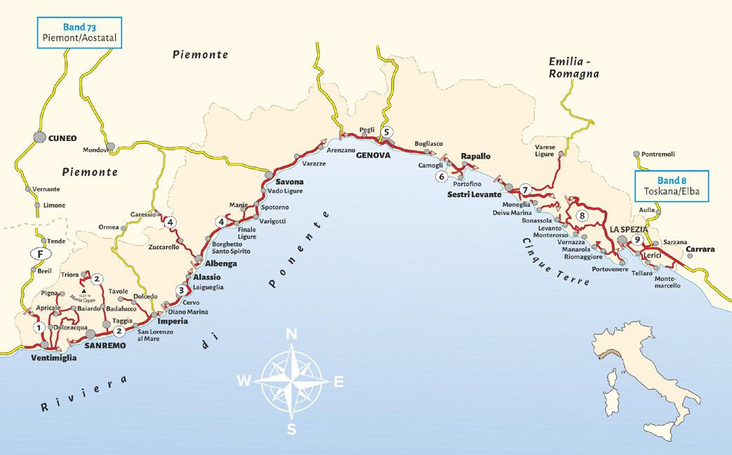 TOURENKARTEN NATUR ERLEBEN, WANDERN KULTURSCHÄTZE, STÄDTE BADEN, SCHAUEN UND GENIESSEN WOMO-SERVICE Die Anleitung für einen Erlebnisurlaub Steigen Sie ein zu abwechslungsreichen Wohnmobiltouren entlang der Küste von der französischen Grenze bis an den Rand der...TOURENKARTEN NATUR ERLEBEN, WANDERN KULTURSCHÄTZE, STÄDTE BADEN, SCHAUEN UND GENIESSEN WOMO-SERVICE Die Anleitung für einen Erlebnisurlaub Steigen Sie ein zu abwechslungsreichen Wohnmobiltouren entlang der Küste von der französischen Grenze bis an den Rand der Toskana. Wir besuchen das Welterbe in Genua, eine der faszinierendsten Großstädte Italiens. Wir klettern durch die Dörfer der Cinque Terre, wir erkunden abgelegene Bergdörfer im Hinterland und wir baden an den schönsten Stränden. Der farbenfroheste Abschnitt des nördlichen Mittelmeers: Dörfer, Häfen, Buchten und wie man sie erreicht Wertvolle Insidertipps: Sehenswürdigkeiten, Wanderungen, Ristoranti, Bootstouren Über 100 Übernachtungs- und Campingplätze mit detaillierten Beschreibungen, Anfahrtswegen und Beurteilungen Gut zu wissen: Der WOMO-Online-Service bietet die GPS-Daten aller Stellplätze dieses Reiseführers auch im WOMO-Shop zum kostenlosen Download an!