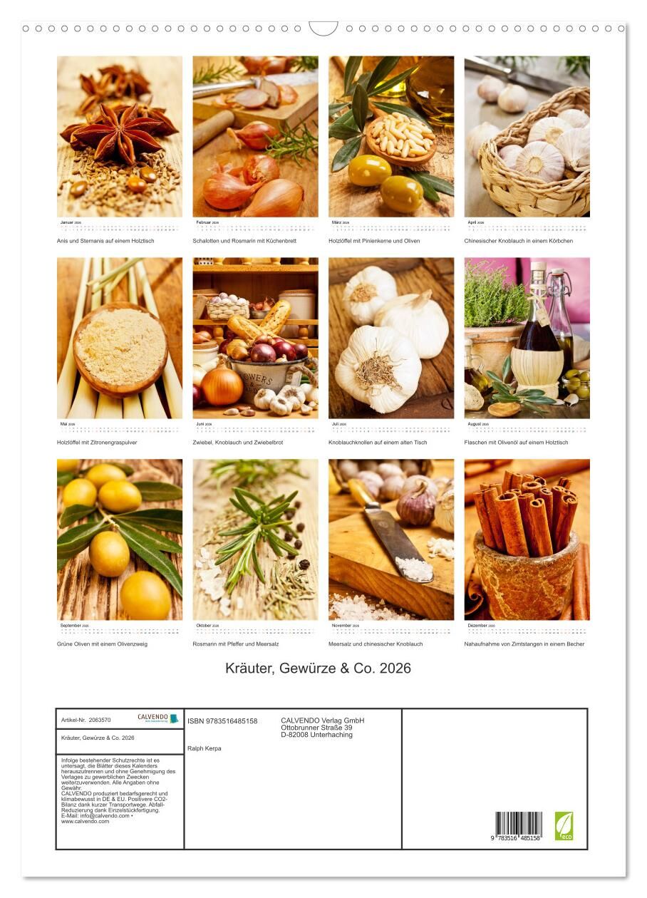 Kräuter und Gewürze verleihen unseren Speisen ein schmackhaftes Aroma. Sie geben den Gerichten ihre ganz persönliche Note. In unserem Kalender finden Sie 12 wundervolle und farbintensive Motive dieser Naturprodukte.