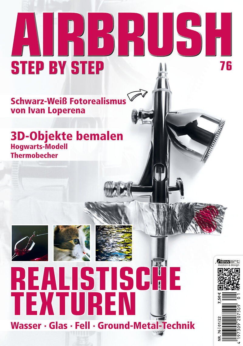 Airbrush Step by Step 76: Realistische Texturen Step by Steps: Wasser-Illustration von Ralph-Torsten Kolmer Stillleben mit Rotwein von Sebastian Arenas Katzenporträt von Benjamin Zikoll Hogwarts 3D-Modell-Bemalung von Alicia Rios Cueva Ground-Metal-Technik von...
