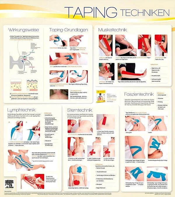 Worauf muss man beim Anlegen eines Tapes achten? Wie erkenne ich die für das Krankheitsbild relevanten Strukturen? Diese Wandtafel zeigt Ihnen, wie's funktioniert - ein praktischer Überblick über die Muskel-, Ligament-, Faszien und Lymphtechnik. So geht's: die einzelnen Tapingschritte step-by-step konkret erklärt. Absolut präzise und nachvollziebar: alle Tapingschritte sind mit Anatomie in vivo kombiniert: Die Tapestreifen werden auf Bodypaintings der Muskeln, Sehnen und Knochen appliziert, so dass genau und "direkt" sichtbar wird, wie und auf welchen Strukturen das Tape liegt.