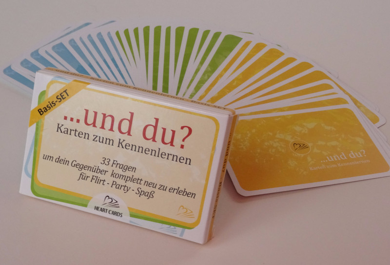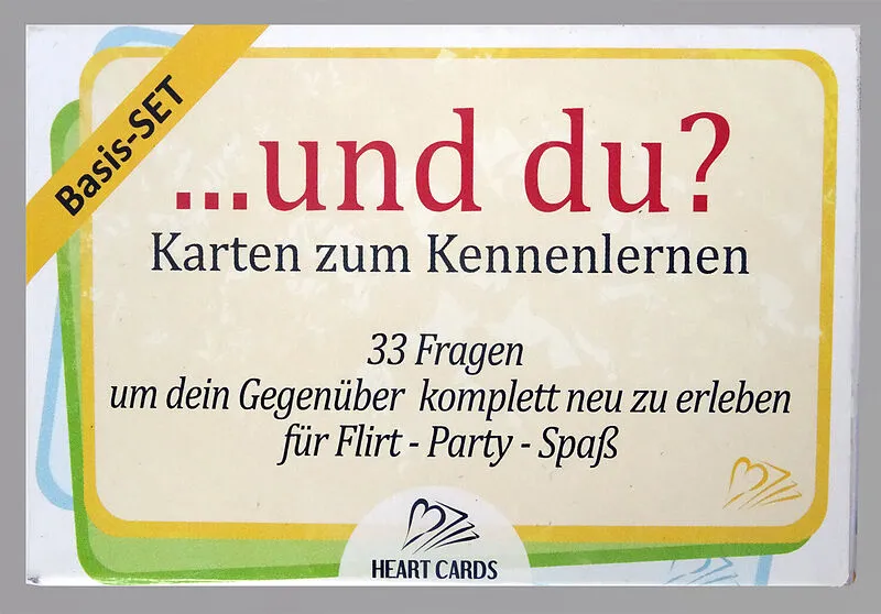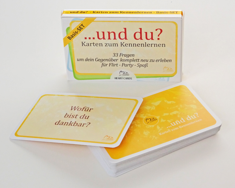 ...und du? - Karten zum Kennenlernen - Basis-Set mit 33 Karten in farbiger Papphülle Neue Menschen kennen zu lernen ist einfacher mit guten Fragen: hier sind sie! Egal, ob Du auf einer Party Unbekannte kennenlernen oder miteinander bekannt machen willst, ob Du beim ersten Treffen mit Deinem Date Unterstützung brauchen kannst oder ob Du Deinen Partner von einer neuen Seite kennenlernen willst: mit dem Kartenspiel "...und du?" wird das einfacher (und für die Schüchternen unter uns: es macht sogar Spaß!) und es gibt keinen (oder kaum) SmallTalk. Die sorgfältig ausgewählten Fragen unterstützen Dich darin, den anderen wirklich näher kennen zu lernen. Ihr kommt euch sofort deutlich näher und es entsteht eine wirkliche Nähe zwischen euch. Übrigens: Diese Fragen unterstützen Kommunikation sinnvoll, und sind deswegen auch für den Unterricht geeignet (Deutsch als Fremdsprache). Fragen zum Kennenlernen Die Fragen des Basis-Sets sind aus allen Lebensbereichen entnommen. Sie sind in drei "Spielstufen" eingeteilt, die immer persönlichere Fragen enthalten. Die Spielstufen sind farblich unterschiedlich gestaltet (blau, grün, orange) und gut zu unterscheiden. Die Fragen sind so formuliert, dass Du immer auch eine 'ausweichende' Antwort finden kannst; aber der Sinn des Spiels ist ja, dass jeder von sich erzählt und sich wirklich in seinem Wesen zeigt. Deswegen gibt es auch ganz wenig Regeln, die dieses Ziel jedoch gut unterstützen. Beispielhafte Fragen: Karten Jedes Spielset der Heart-Cards Serie "...und du?" besteht aus 33 Karten im normalen Spielkartenformat (92x58mm) im hochwertigen Vierfarbdruck auf speziellen Spielkartenkarton gedruckt. Die Hülle ist aus Pappe und ebenfalls vierfarbig bedruckt. Das Basis-Set erscheint in der Reihe "...und du?" der Heart-Cards des Acasha Verlags Berlin. Weitere Ausführungen: ... und du? - Ü18-Set mit Fragen aus den Bereichen Beziehung, Partnerschaft und Sexualität