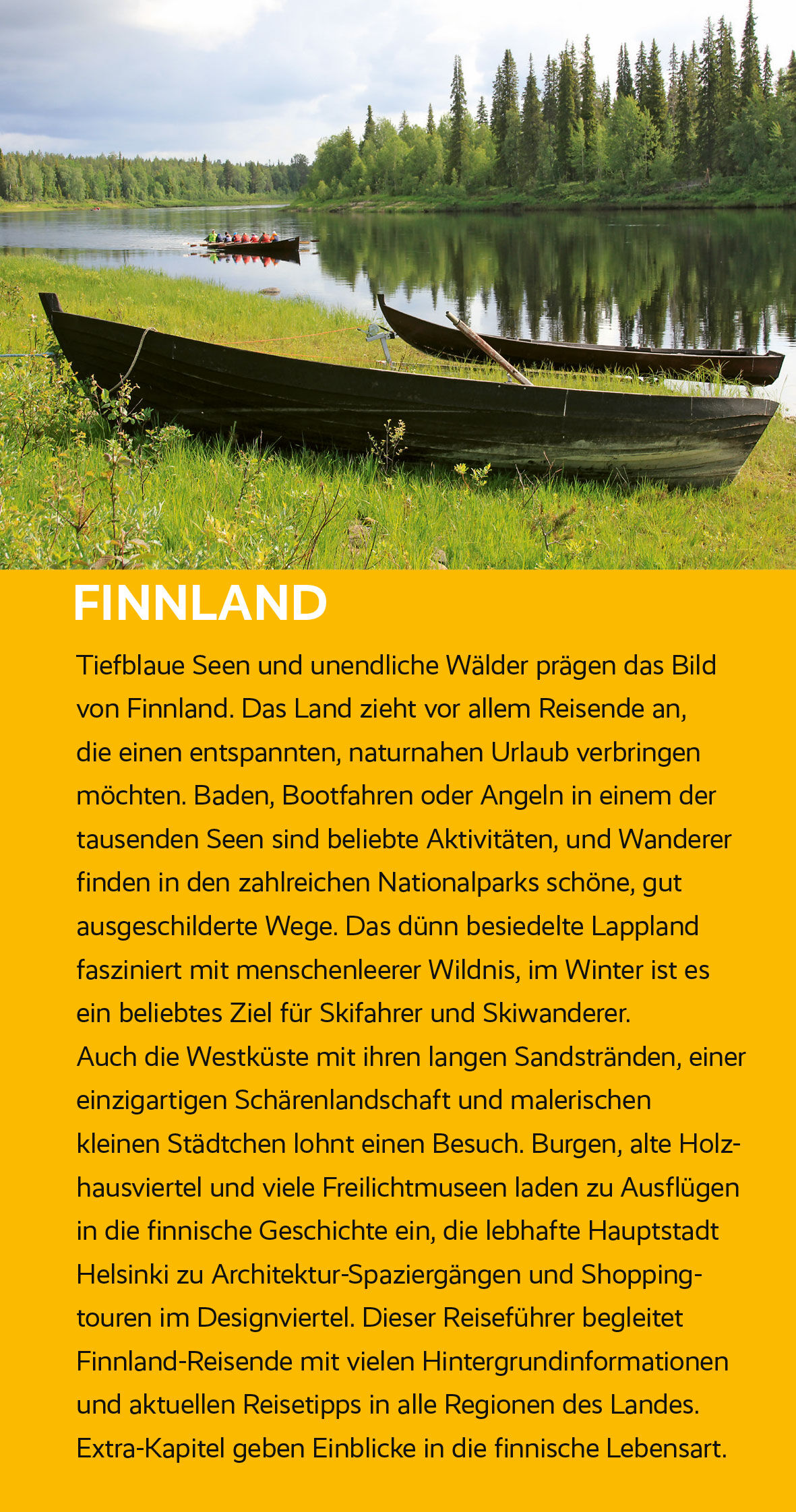Finnland ist ein Traumziel für naturverbundene Urlauber. Im Land der Polarlichter gehen Erholung und Ruhe mit sanftem Tourismus und Aktivität in der Natur Hand in Hand. Der Trescher-Reiseführer FINNLAND ist ein wertvoller Begleiter unterwegs zwischen Schärenwe...