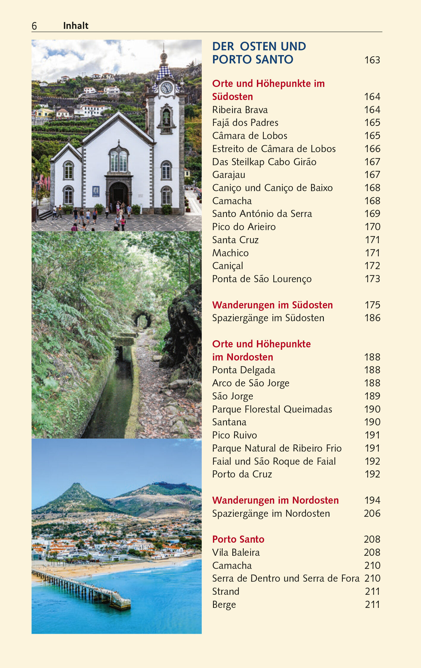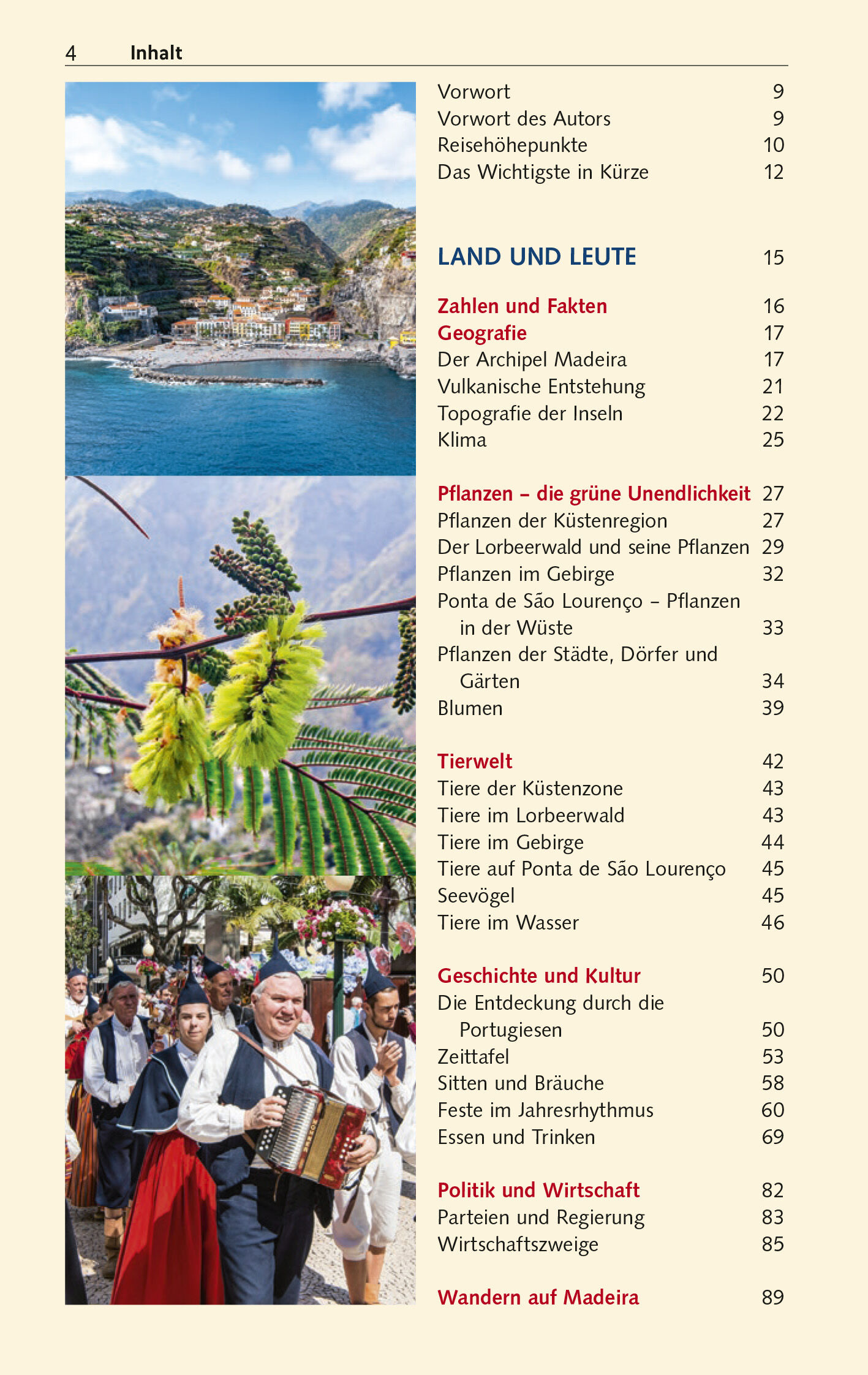 Vorwort 9 Reisehöhepunkte 10 Das Wichtigste in Kürze 12 LAND UND LEUTE 15 Zahlen und Fakten 16 Geografie 17 Der Archipel Madeira 17 Vulkanische Entstehung 21 Topografie der Inseln 22 Klima 25 Pflanzen die grüne Unendlichkeit 27 Pflanzen der Küstenregion 27 Der Lorbeerwald und seine Pflanzen 29 Pflanzen im Gebirge 32 Ponta de São Lourenço Pflanzen in der Wüste 33 Pflanzen der Städte, Dörfer und Gärten 34 Blumen 39 Tierwelt 42 Tiere der Küstenzone 43 Tiere im Lorbeerwald 43 Tiere im Gebirge 44 Tiere auf Ponta de São Lourenço 45 Seevögel 45 Tiere im Wasser 46 Geschichte und Kultur 50 Die Entdeckung durch die Portugiesen 50 Zeittafel 53 Sitten und Bräuche 58 Feste im Jahresrhythmus 60 Essen und Trinken 69 Politik und Wirtschaft 82 Parteien und Regierung 83 Wirtschaftszweige 85 Wandern auf Madeira 89 FUNCHAL UND UMGEBUNG 99 Funchal Madeiras Hauptstadt und Metropole 100 Sehenswertes im Stadtzentrum 100 Sehenswertes außerhalb des Stadtzentrums 107 Museen 115 Stadtrundgänge 117 Funchal-Informationen 121 Wanderungen in und um Funchal 125 DER WESTEN 129 Orte und Höhepunkte im Südwesten 130 Ponta do Pargo 130 Fajã da Ovelha 130 Paúl do Mar 130 Prazeres 131 Jardim do Mar 131 Calheta 132 Madalena do Mar 133 Ponta do Sol 134 Lugar de Baixo 134 Wanderungen im Südwesten 137 Spaziergänge im Südwesten 142 Orte und Höhepunkte im Nordwesten 143 Achadas da Cruz 143 Santa Maria Madalena 143 Porto Moniz 144 Ribeira da Janela 145 Rabaçal 145 Lorbeerwald von Fanal 146 Paúl da Serra 146 Seixal 147 Chão da Ribeira 147 São Vicente 148 Wanderungen im Nordwesten 150 Spaziergänge im Nor…