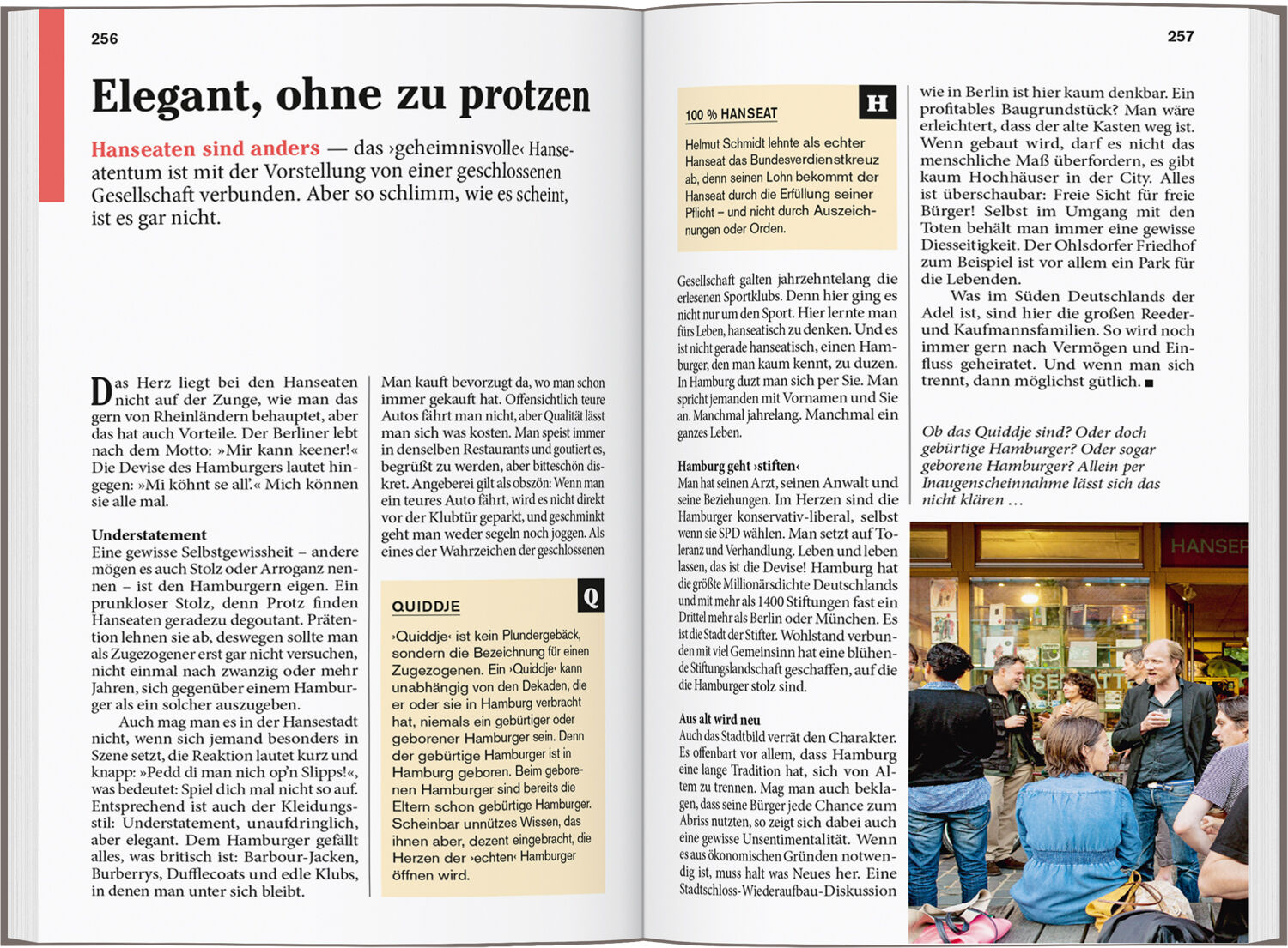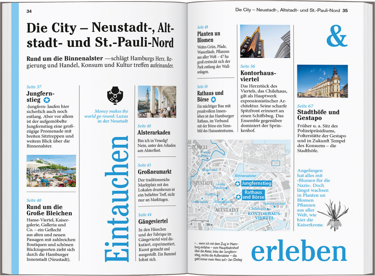 Senkrechtstarter, Überflieger, Kreuz und quer. Vor Ort die Kapitel: Die City Neustadt-, Altstadt- und St.-Pauli-Nord, HafenCity/Speicherstadt/Alt- und Neustadt- Süd, Südliches St. Pauli und das Altonaer Elbufer, Schanzen- und Karolinenviertel, Rotherbaum/Harvestehude/Eppendorf, St. Georg, Ottensen und Altona-Altstadt, Das Elbufer zwischen Altona und Blankenese, Veddel/Wilhelmsburg/Harburg. Das Kleingedruckte (Reiseinfos von A bis Z). Das Magazin. Offene Fragen.