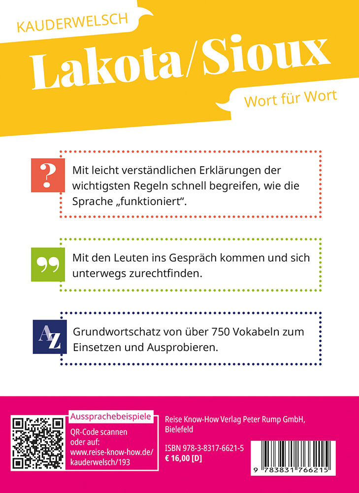 Schnell und einfach Lakota lernen mit dem Kauderwelsch-Sprachführer Sioux / Lakota Lakota, die Sprache der Sioux , ist eine der bedeutendsten indigenen Sprachen Nordamerikas. Nachdem sie in der Vergangenheit durch koloniale Unterdrückung stark zurückgedrängt w...