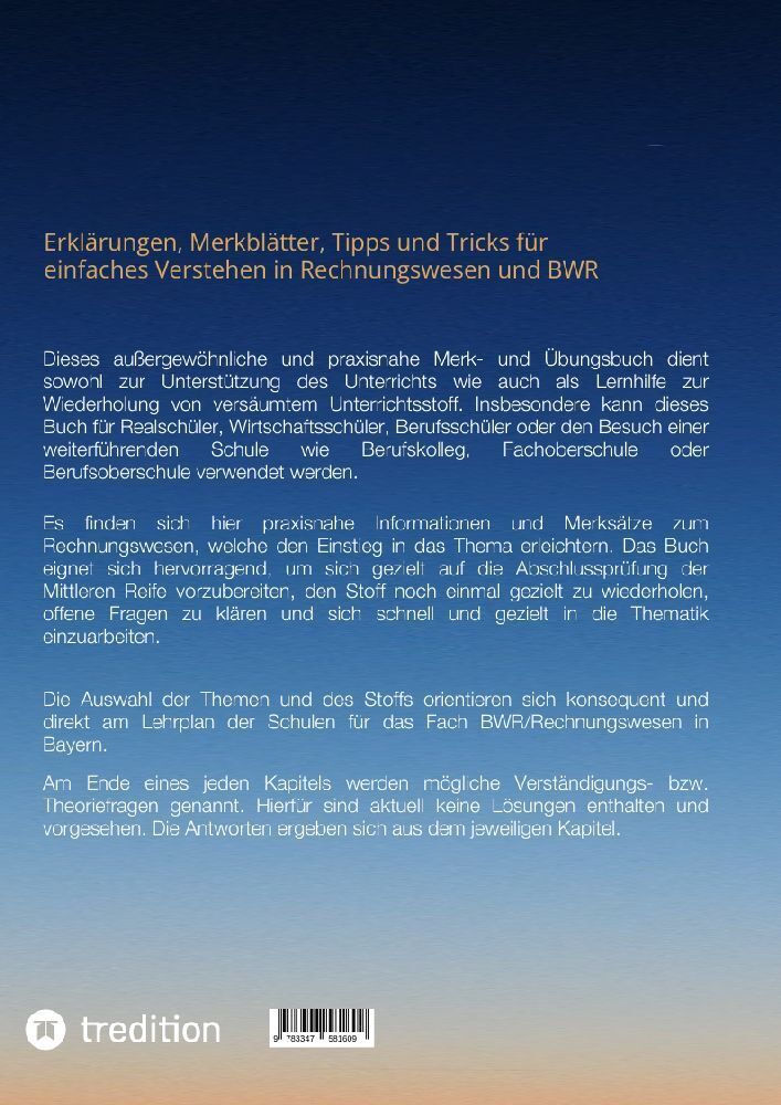 Endlich einfach erklärt: Alle Themen aus dem Rechnungswesen oder betriebswirtschaftliches Rechnen (BWR) zur Vorbereitung auf die Mittlere Reife in der Realschule in einem Buch. Diese werden mittels leicht verständlichen Erklärungen, Merkblättern und Hinweisen ...
