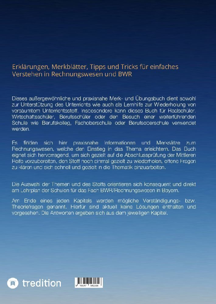Endlich einfach erklärt: Alle Themen aus dem Rechnungswesen oder betriebswirtschaftliches Rechnen (BWR) zur Vorbereitung auf die Mittlere Reife in der Realschule in einem Buch. Diese werden mittels leicht verständlichen Erklärungen, Merkblättern und Hinweisen ...