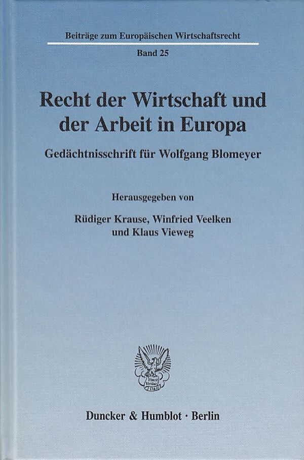 Inhalt: R. Krause / W. Veelken / K. Vieweg, Zum Gedenken an Wolfgang Blomeyer - I. Arbeit: G. Arzt, Arbeitszeitkontrolle aus strafrechtlicher Sicht - V. Behr, Internationale Zuständigkeit in Individualarbeitsrechtsstreitigkeiten im Europäischen Verfahrensrecht - R. Birk, Kollisionsrechtliche Aspekte des reformierten BetrAVG - M. Fuchs, Flexibilisierung des Arbeitsrechts - S. Grundmann, Zum Harmonisierungskonzept im Europäischen Arbeitsrecht - K. Kastner, Sklaverei oder Arbeitsverhältnisse? Historische und rechtliche Aspekte der Zwangsarbeit des nationalsozialistischen Regimes - U. Köbl, Sozialeinkommen für Arbeitsfähige ohne Arbeitswillen? - D. Leipold, Einige Bemerkungen zur Internationalen Zuständigkeit in Arbeitssachen nach Europäischem Zivilprozessrecht - W. Marotzke, Die Freistellung von Arbeitnehmern im Insolvenz-Eröffnungsverfahren - G. Ries, Arbeitsrecht in der Frühzeit der Geschichte - K. Riesenhuber, Arbeitnehmerschutz durch Information beim Betriebsübergang. Die Information von Arbeitnehmervertretern und Arbeitnehmern durch Veräußerer und Erwerber nach der Betriebsübergangsrichtlinie - M. Rohe, Schutz vor Diskriminierung aus religiösen Gründen im Europäischen Arbeitsrecht: Segen oder Fluch? - K. A. Schachtschneider, Flächentarife und die Soziale Frage - H.-D. Spengler, Zugleich Person und Sache, vielleicht Arbeitstier oder Unternehmer: Rechtliche Aspekte der römischen Sklaverei - S. Weth, Rechtsprobleme der bargeldlosen Lohnzahlung - II. Wirtschaft: P. Chrocziel, Insolvenz des Lizenzgebers: Dinglichkeit der Lizenz? - M. Fischer, Körperschaftsteuerrechtliche Organschaft und Konzernrecht - R. Greger, Hybride Formen der Wirtschaftsmediation - H. Herrmann, Transparente Zillmerung und Europarecht der Verbraucherinformation - J. C. Joerden, Zur Versuchsstrafbarkeit beim Betrug und seinen Derivaten im Wirtschaftsstrafrecht - R. Krause, Zum Vorhaben einer Europäischen Privatgesellschaft - K. Laubenthal, Vollzug von Freiheitsstrafen durch private Unternehmen - W. Reiß, Umsatzsteuer und Insolvenz - W.-H. Roth, Staatliche Wirtschaftsregulierung, Selbstregulierung und EG-Kartellrecht. Eine Zwischenbilanz - F. Streng, Berufsziel "Wirtschaftsjurist"; ein Beitrag zur Juristensoziologie - W. Veelken, Zur Mitbestimmung bei der Europäischen Aktiengesellschaft - K. Vieweg, Die Europäische Genossenschaft (SCE): Initialzündung für eine Reform der eingetragenen Genossenschaft? - III. Europa: M. Germann / H. de Wall, Kirchliche Dienstgemeinschaft und Europarecht - R. Hausmann, Der Renvoi im deutschen internationalen Gesellschaftsrecht nach "Überseering" und "Inspire Art" - C. Hillgruber, Die Verwirklichung des Binnenmarktes durch Rechtsangleichung: Gemeinschaftsziel und -kompetenz ohne Grenzen? - B. Heß, Neue Formen der Rechtshilfe in Zivilsachen im Europäischen Justizraum - M. Jestaedt, Der Europäische Verfassungsverbund: Verfassungstheoretischer Charme und rechtstheoretische Insuffizienz einer Unschärferelation - C. Link, Antidiskriminierung und kirchliches Arbeitsrecht - H. Sodan, Die gesetzlichen Krankenkassen als Unternehmen im Sinne des europäischen Gemeinschaftsrechts - IV. Varia: R. Bartlsperger, Der großräumige Eigentumseingriff als Problem des grundrechtlichen Eingriffspotentials - V. Erb, Absprachen im Strafverfahren als Quelle unbeherrschbarer Risiken für den Rechtsstaat - K. H. Gössel, Über die sog. "Einigung" im Strafverfahren - J. Hruschka, Das deontologische Sechseck in der Jurisprudenz - K. Kühl, Welche sozialstaatlichen Elemente verträgt eine freiheitliche Eigentumsordnung? Eine rechtsphilosophische Skizze - H. Prütting, Internationale Zuständigkeit und Revisionsinstanz - G. Schiemann, Sachschadensrecht und Solidarität - H. Stöckel, Das Adhäsionsverfahren: Durchsetzung zivilrechtlicher Forderungen im Strafverfahren - M. Vollkommer, Der Verbraucher als Wettbewerbshüter. Zur wettbewerbsrechtlichen Auslegung der §§ 241a, 661a BGB - R. Zippelius, Zur Praktikabilität der Gerechtigkeitstheorie von John Rawls - Veröffentlichungen von Wolfgang Blomeyer