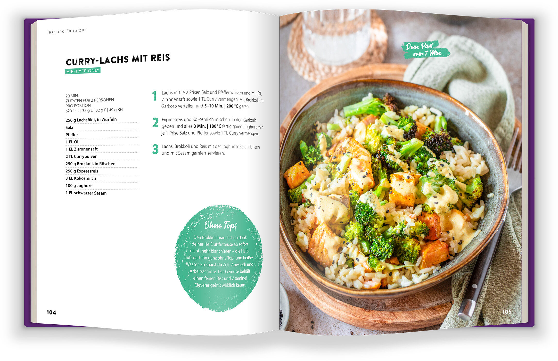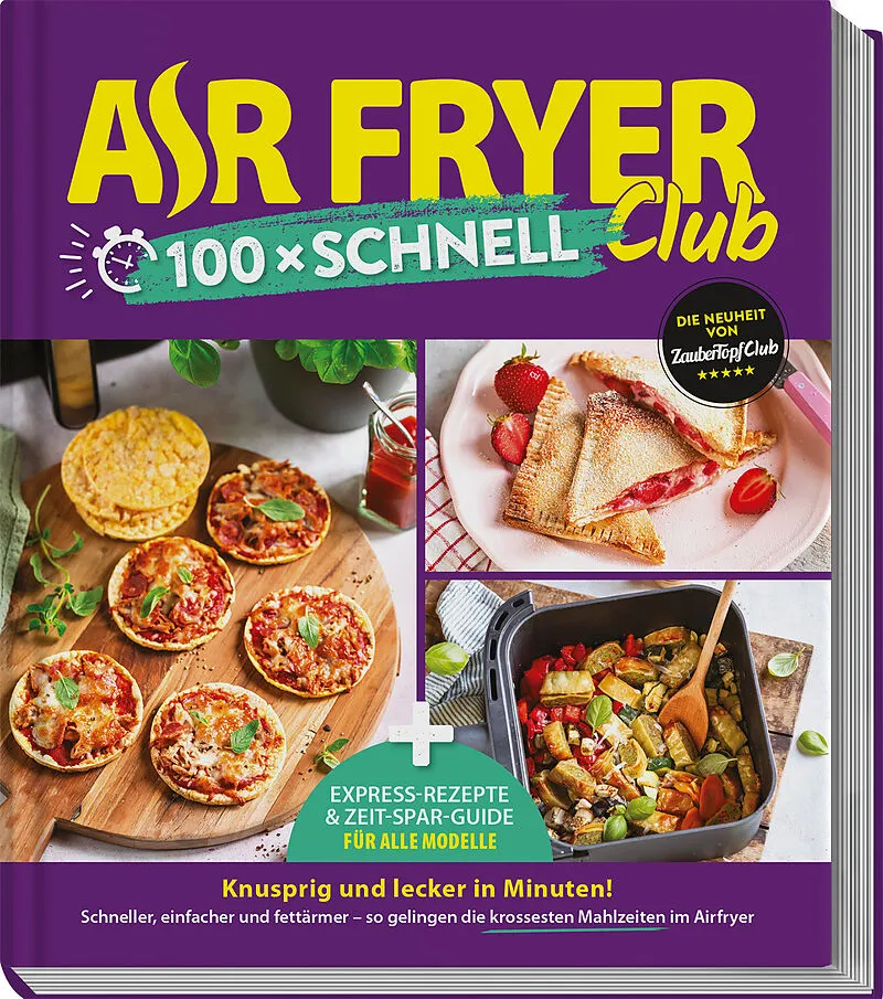 Schnell, knusprig, einfach wow! Mit deiner Heißluftfritteuse wird gutes Essen jetzt zum Turbo-Genuss: 100 x schnell liefert dir Rezepte, die im Rekordtempo fertig sind fettarm, alltagstauglich und randvoll mit Geschmack. Ob knusprige Wraps, aromatische Gemüse...