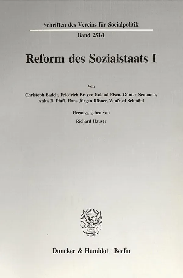 Inhalt: R. Eisen, Reformüberlegungen zur Arbeitslosenversicherung - A. B. Pfaff, Notwendigkeit und Möglichkeiten der Weiterentwicklung der gesetzlichen Krankenversicherung - G. Neubauer, Gesundheitsreform 2000: Ziele, Konzeption, Instrumente - W. Schmähl, Änderung der Finanzierungsstruktur der sozialen Sicherung und insbesondere der Sozialversicherung als wichtiges Element eines »Umbaus« des deutschen Sozialstaats. Allokative, distributive und ordnungspolitische Begründungen, quantitative Dimensionen und ökonomische Wirkungen - F. Breyer, Sind »äquivalente« Renten fair? - C. Badelt, Soziale Dienstleistungen und der Umbau des Sozialstaats