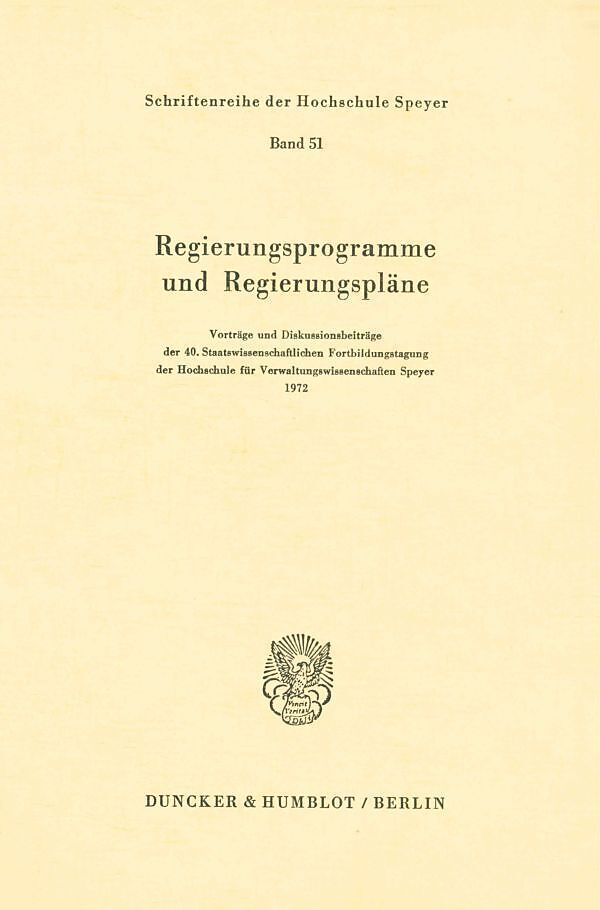 Inhalt F. Wagener Regierungsprogramme und Regierungspläne in Bund und Ländern. Überblick R. Herzog Regierungsprogramme und Regierungspläne im demokratischen und sozialen Rechtsstaat P. Kistner Die Bundesstaatsproblematik der Regierungsprogramme und Regierungsp...