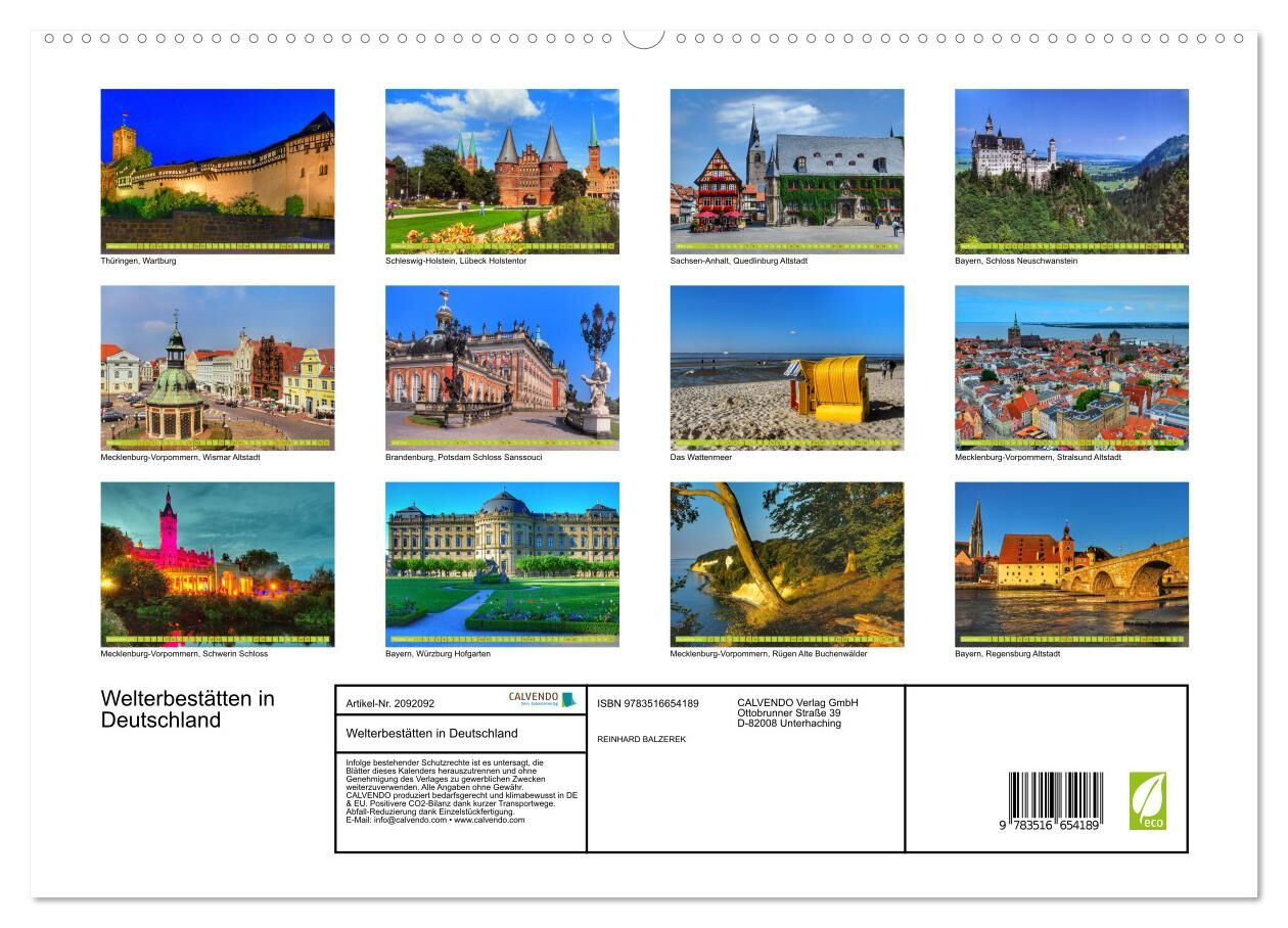 Hochwertiger Wandkalender mit 13 wunderschönen Bildern, die Alten Buchenwälder von der Insel Rügen bis zum Schloss Neuschwanstein in Bayern. Dieser Kalender von Fotograf Reinard Balzerek, zeigt die UNESCO-Welterbestädte in Deutschland.