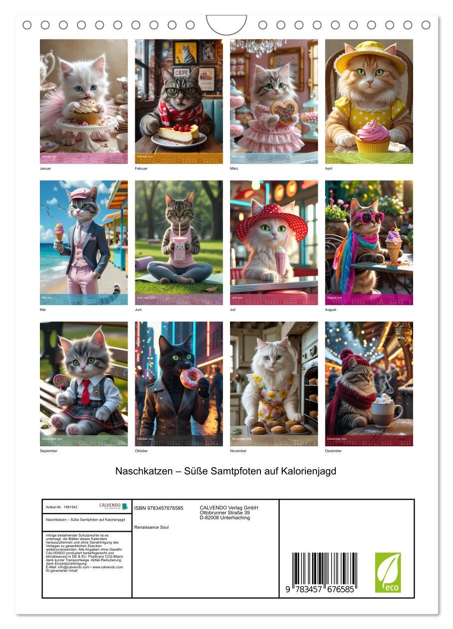 "Naschkatzen Süße Samtpfoten auf Kalorienjagd" ist ein liebevoll gestalteter Kalender für alle, die Katzen und süße Leckereien lieben. Charmant und verspielt präsentieren sich vermenschlichte Samtpfoten in niedlicher Kleidung beim Naschen von Cupcakes, Eis, Ku...
