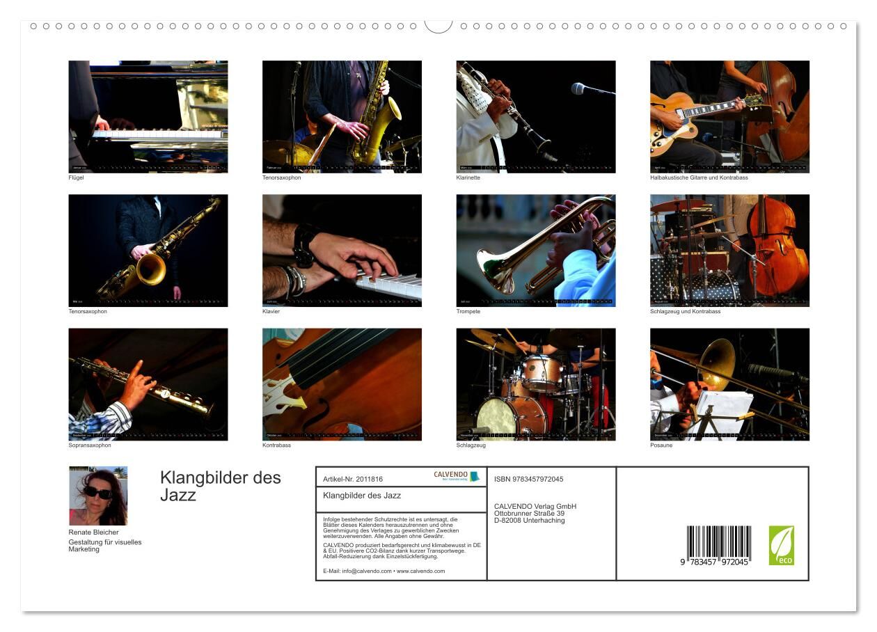 Atmosphärische Konzertfotografien und Aufnahmen klassischer Jazzinstrumente machen diesen Kalender zu einem visuelles Klangerlebnis der besonderen Art. Das passende Geschenk für alle Freunde des Jazz.