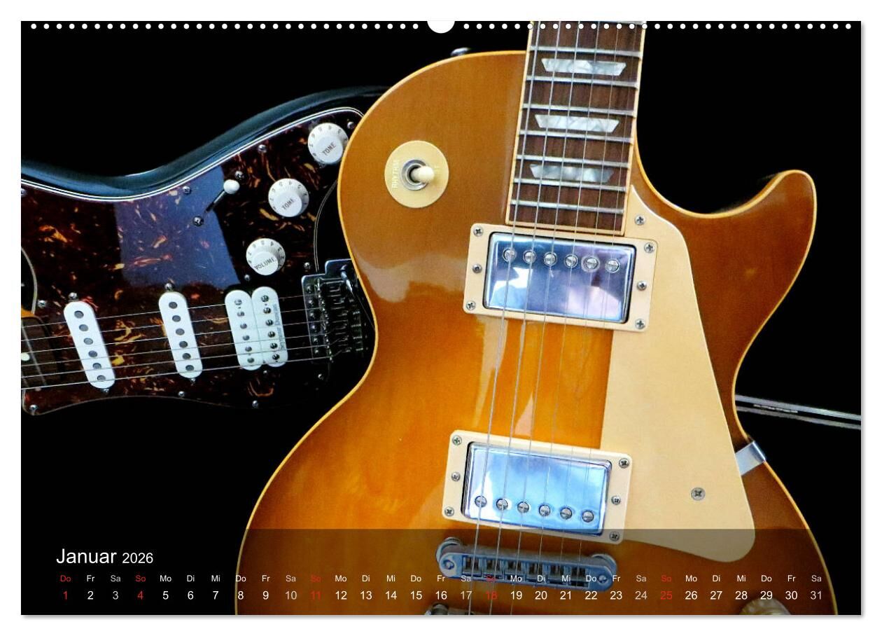 Auf jedem Kalenderblatt präsentieren sich Gitarren aus verschiedenen Blickwinkeln. Verfallen auch Sie der Faszination dieses Musikinstruments und dem Spiel mit den Saiten.
