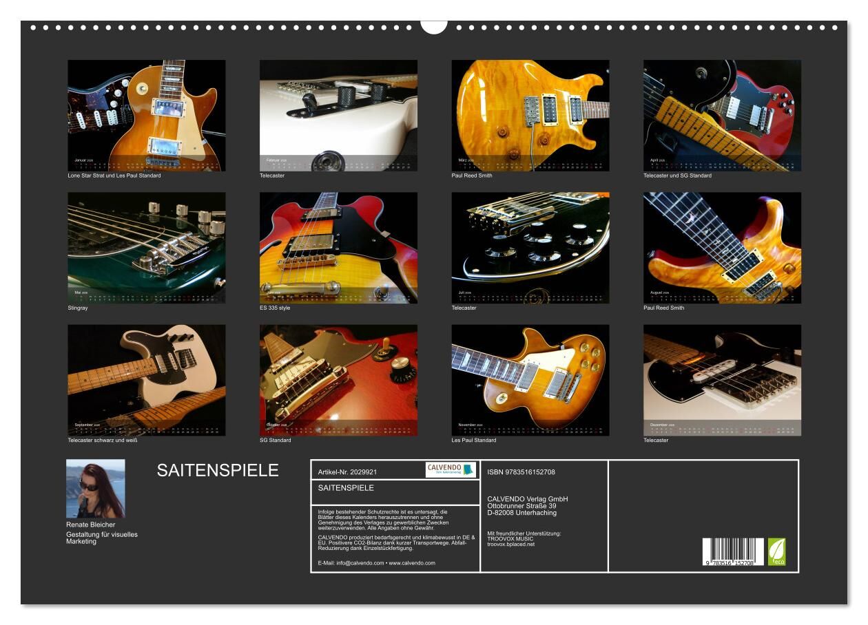 Auf jedem Kalenderblatt präsentieren sich Gitarren aus verschiedenen Blickwinkeln. Verfallen auch Sie der Faszination dieses Musikinstruments und dem Spiel mit den Saiten.