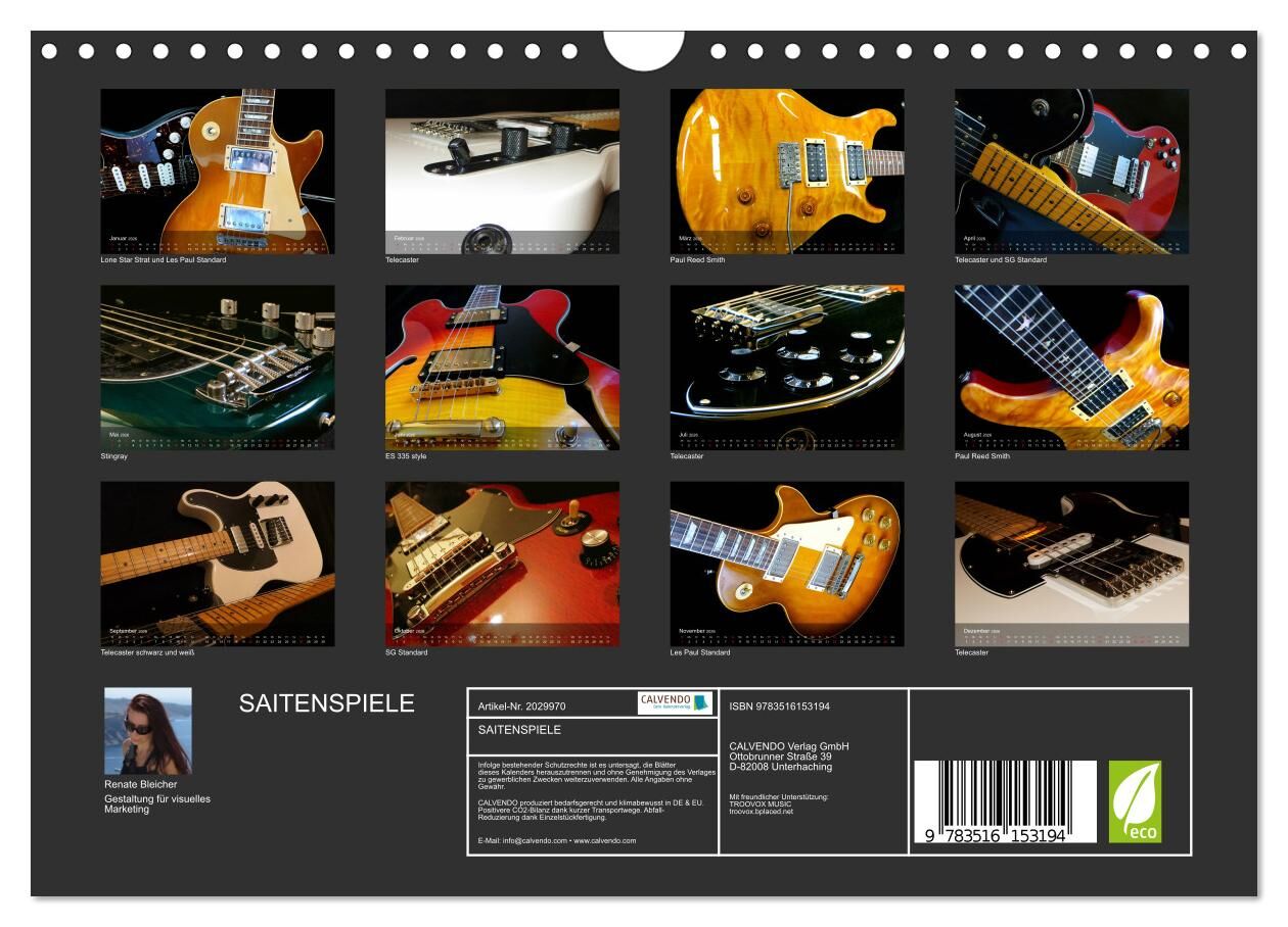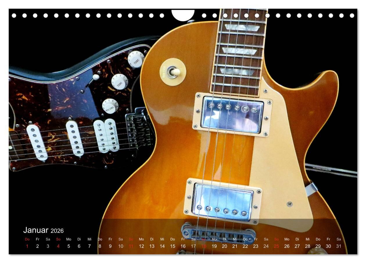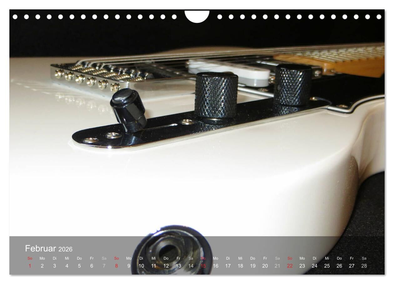 Auf jedem Kalenderblatt präsentieren sich Gitarren aus verschiedenen Blickwinkeln. Verfallen auch Sie der Faszination dieses Musikinstruments und dem Spiel mit den Saiten.