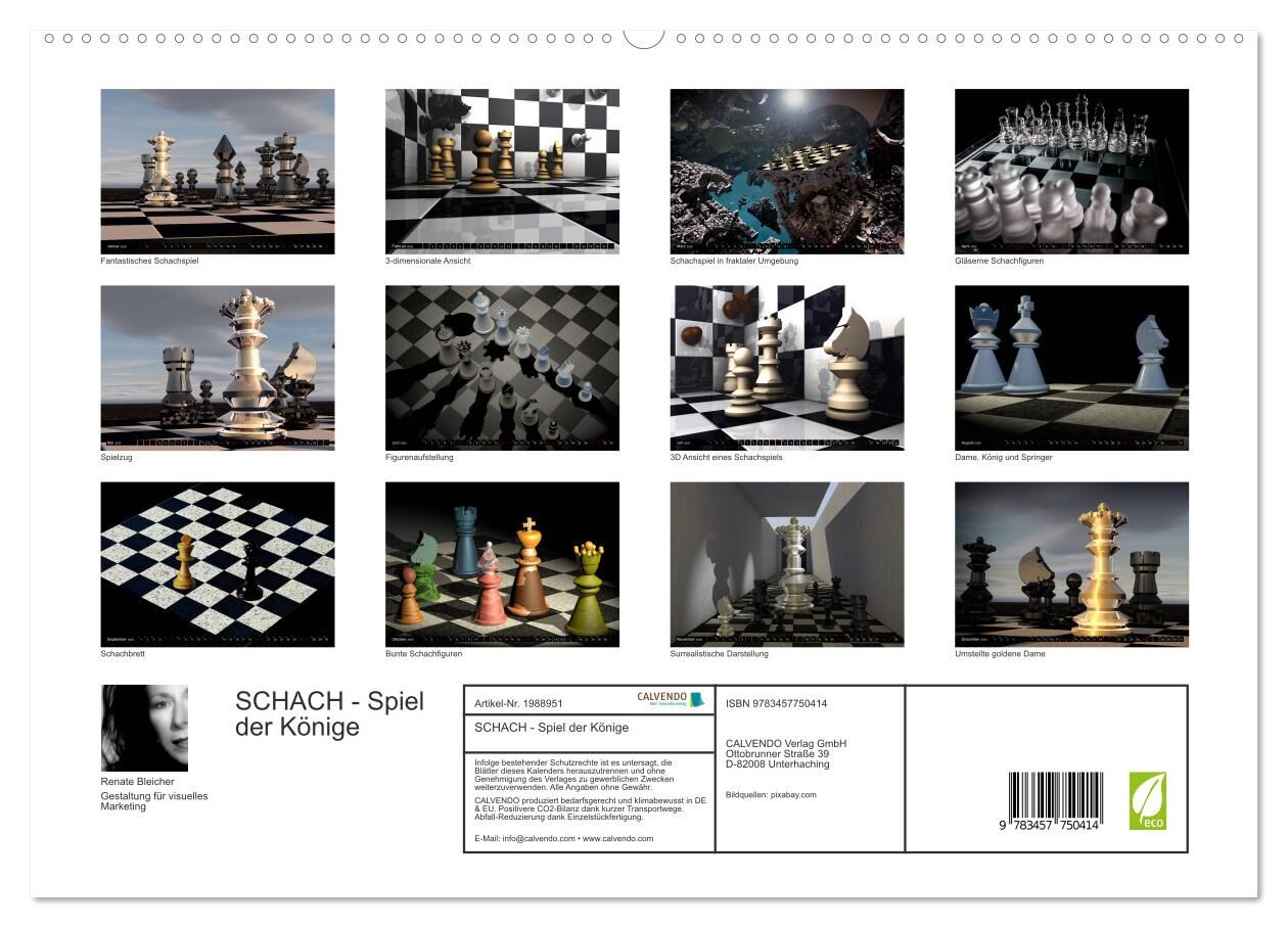 Das Wort Schach wurde vom persischen Wort "Schah" abgeleitet, was König bedeutet. Daher wird Schach gerne als Spiel der Könige bezeichnet, oder auch das königliche Spiel. Auf jedem Kalenderblatt faszinieren uns fantastische Bilder dieses strategischen Brettspi...