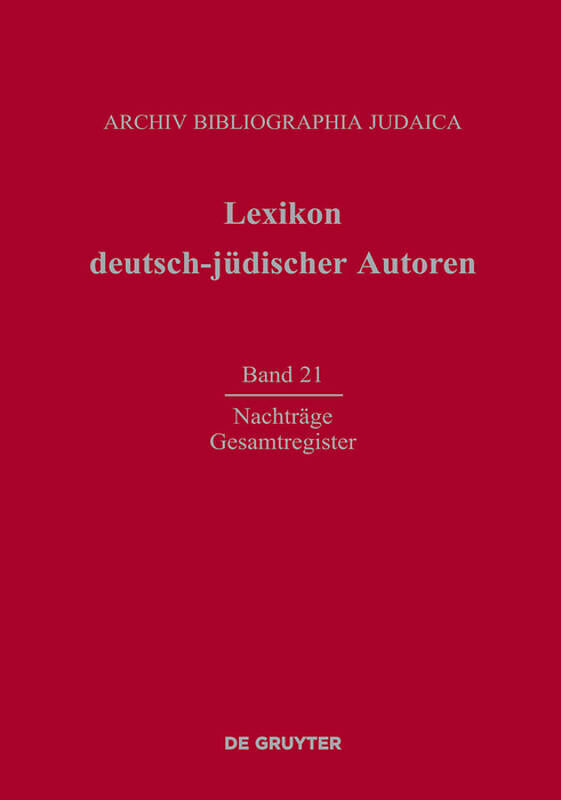 This final volume of supplements and indexes completes the Encyclopedia of German-Jewish Authors (Vol. 1, 1992 through Vol. 20, 2012). This volume contains entries pertaining to about 15 additional authors, including Saul Ascher, Rudolf Borchardt, and Ernst H...