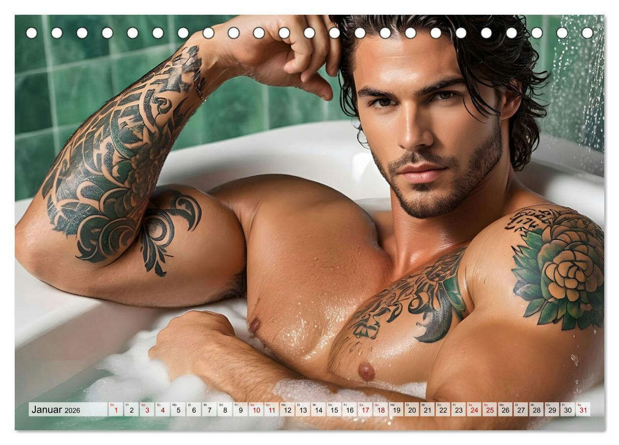 Heiße Kerle im Badeschaum - Muskeln, Tattoos und Wasserspiele (Tischkalender 2026 DIN A5 quer), CALVENDO Monatskalender