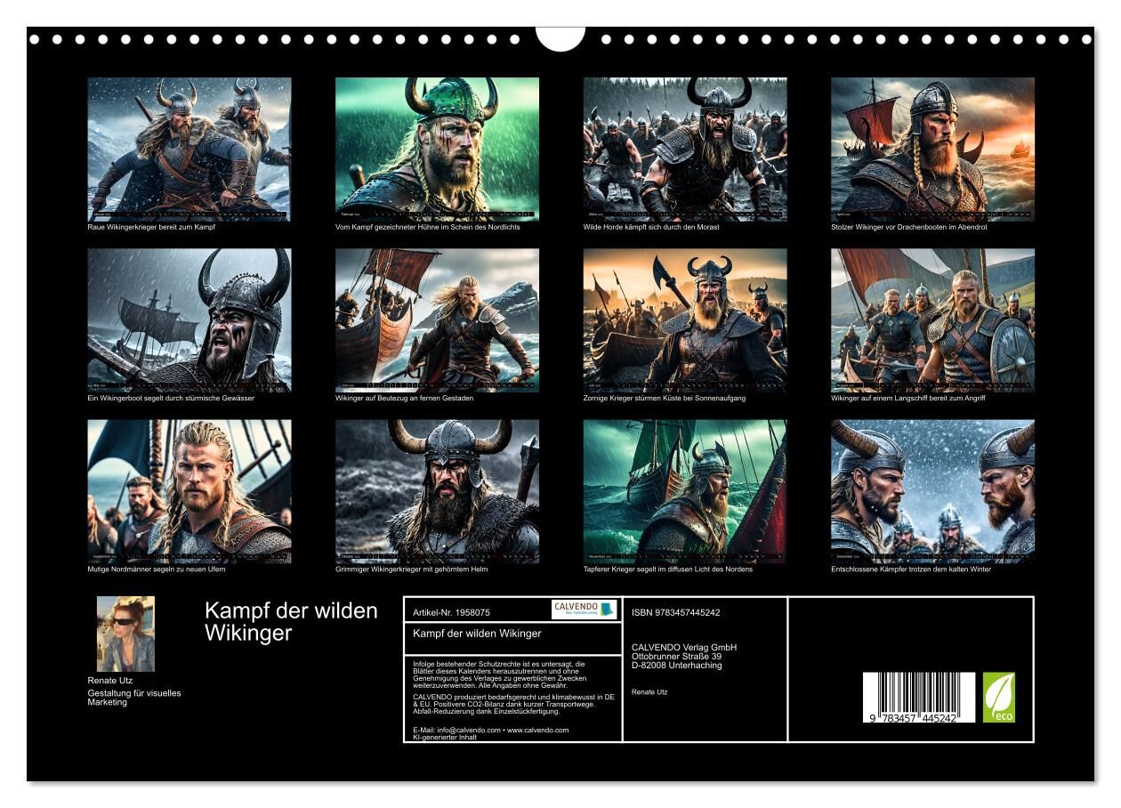 Zahlreiche Mythen ranken sich um das kriegerische Volk der Wikinger. Der außergewöhnliche, mithilfe von KI erstellte, Kalender von Renate Utz erlaubt Dir einen Blick in vergangene Zeiten, wo kämpferische Nordmänner mit hölzernen Drachenbooten aufbrachen, die W...