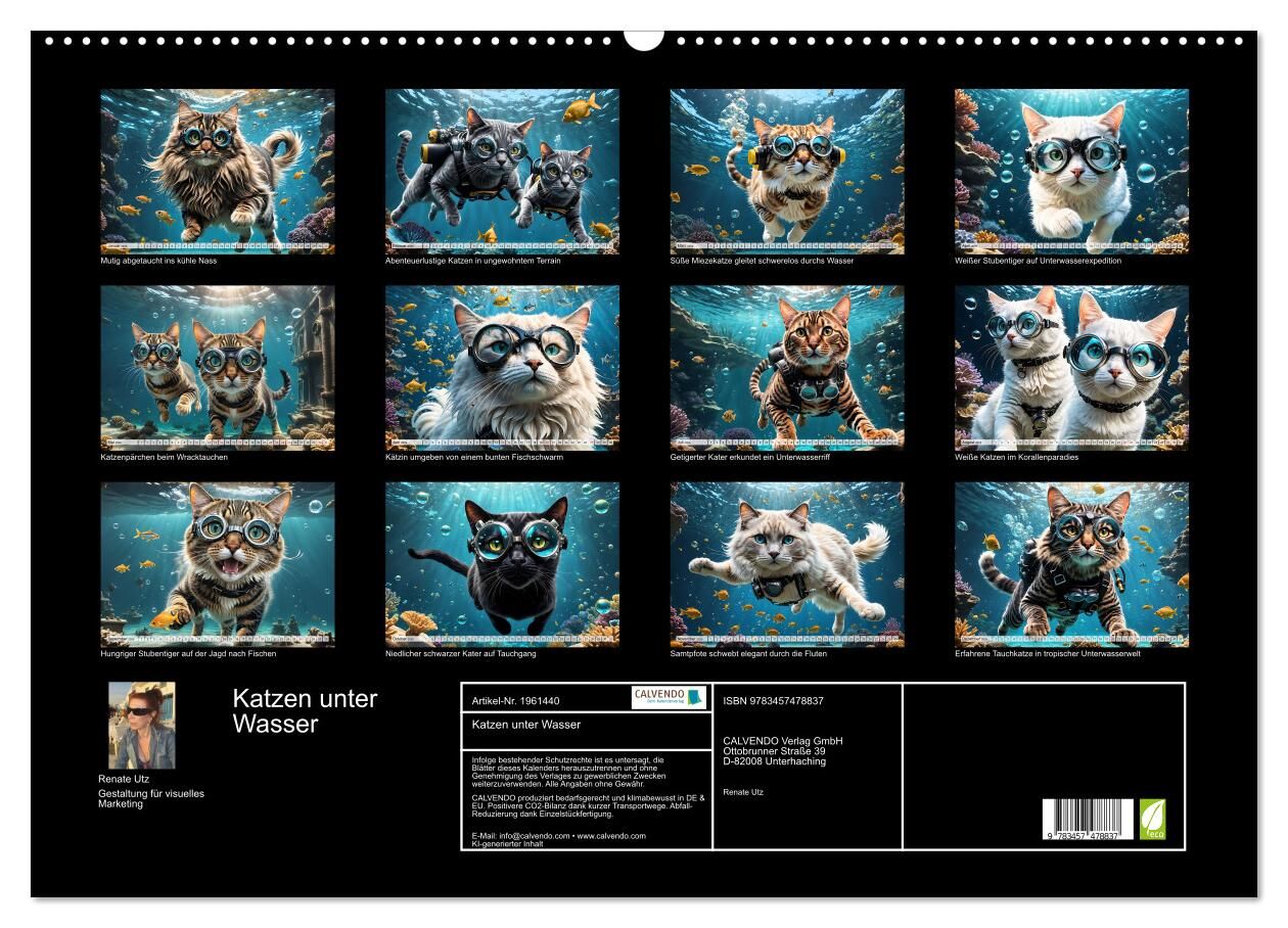 Von wegen wasserscheu, diese bezaubernden Stubentiger haben das kühle Nass und den Tauchsport für sich entdeckt. Der einzigartige, mit KI erstellte Katzenkalender von Renate Utz präsentiert erheiternde Bilder von mutigen Miezekatzen, die neugierig und elegant ...